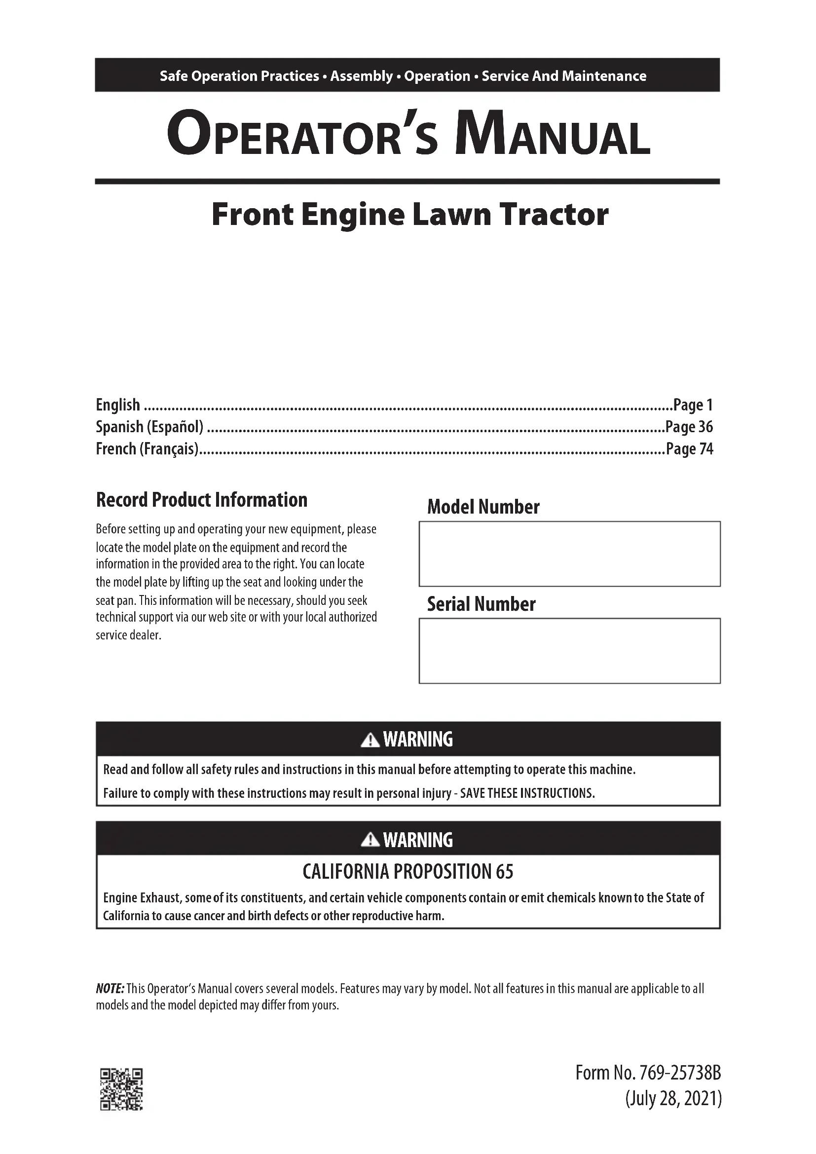 Safe Operation Practices • Assembly • Operation • Service And Maintenance OperatOr’s Manual Front Engine Lawn Tractor NOTE: This Operator’s Manual covers several models. Features may vary by model. Not all features in this manual are applicable to all models and the model depicted may differ from yours. WARNING Read and follow all safety rules and instructions in this manual before attempting to operate thismachine. Failure to comply with these instructions may result in personal injury - SAVE THESE INSTRUCTIONS. WARNING CALIFORNIA PROPOSITION 65 Engine Exhaust, some of its constituents, and certain vehicle components contain or emit chemicals known to the State of California to cause cancer and birth defects or other reproductive harm. Record Product Information Before setting up and operating your new equipment, please locate the model plate on the equipment and record the information in the provided area to the right. You can locate the model plate by lifting up the seat and looking under the seat pan. This information will be necessary, should you seek technical support via our web site or with your local authorized service dealer. Model Number Serial Number English ......................................................................................................................................Page 1 Spanish (Español) ....................................................................................................................Page 36 French (Français) ......................................................................................................................Page 74 Form No. 769-25738B (July 28, 2021)2