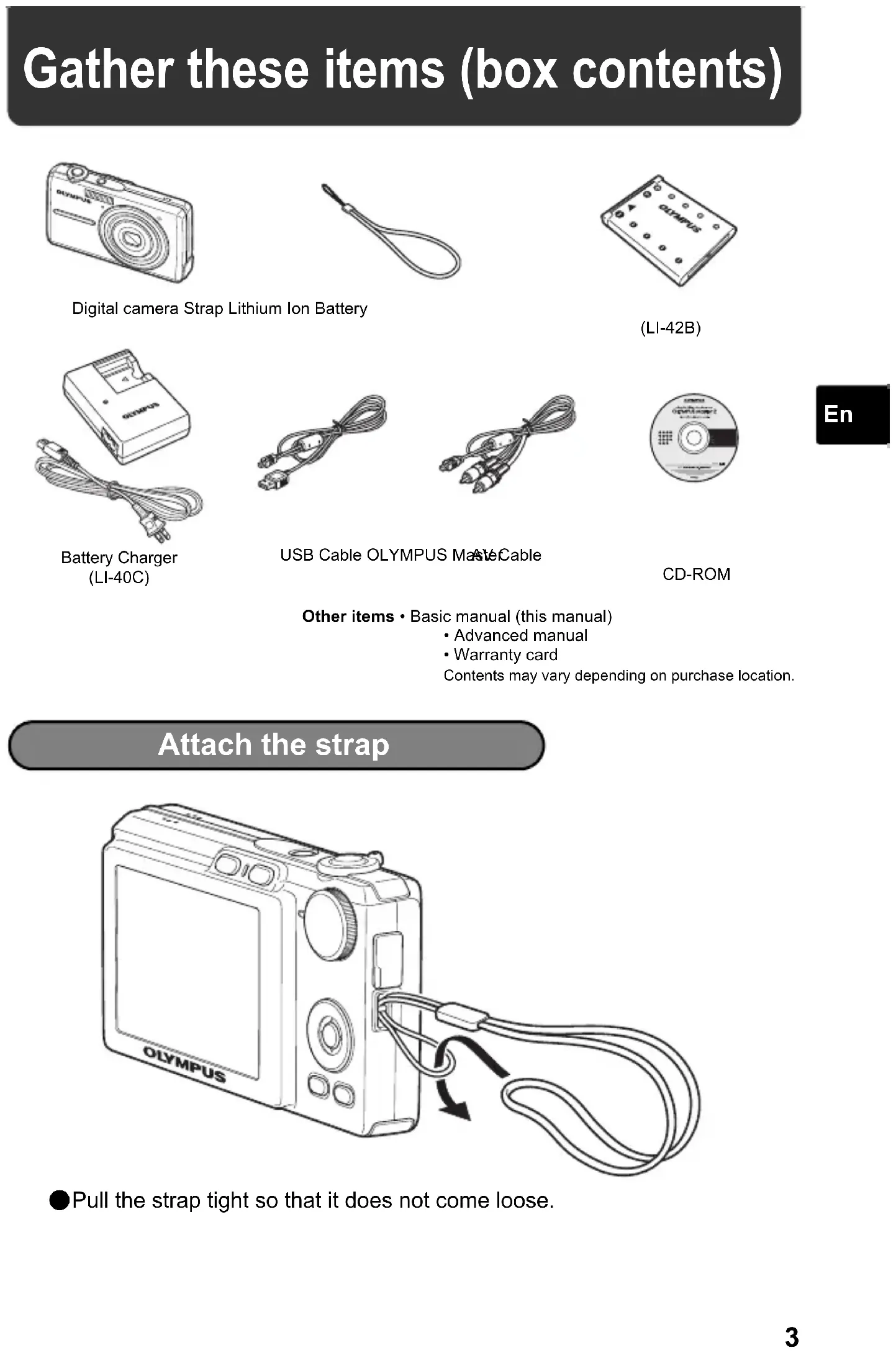 Gather these items (box contents) Attach the strap ( Pull the strap tight so that it does not come loose. Digital camera Strap Lithium Ion Battery (LI-42B)Battery Charger (LI-40C)USB Cable OLYMPUS Master CD-ROMOther items • Basic manual (this manual)• Advanced manual• Warranty cardContents may vary depending on purchase location.AV Cable d4337_oai_e_basic_00_bookfile.book Page 3 Wednesday, November 29, 2006 5:45 PM4