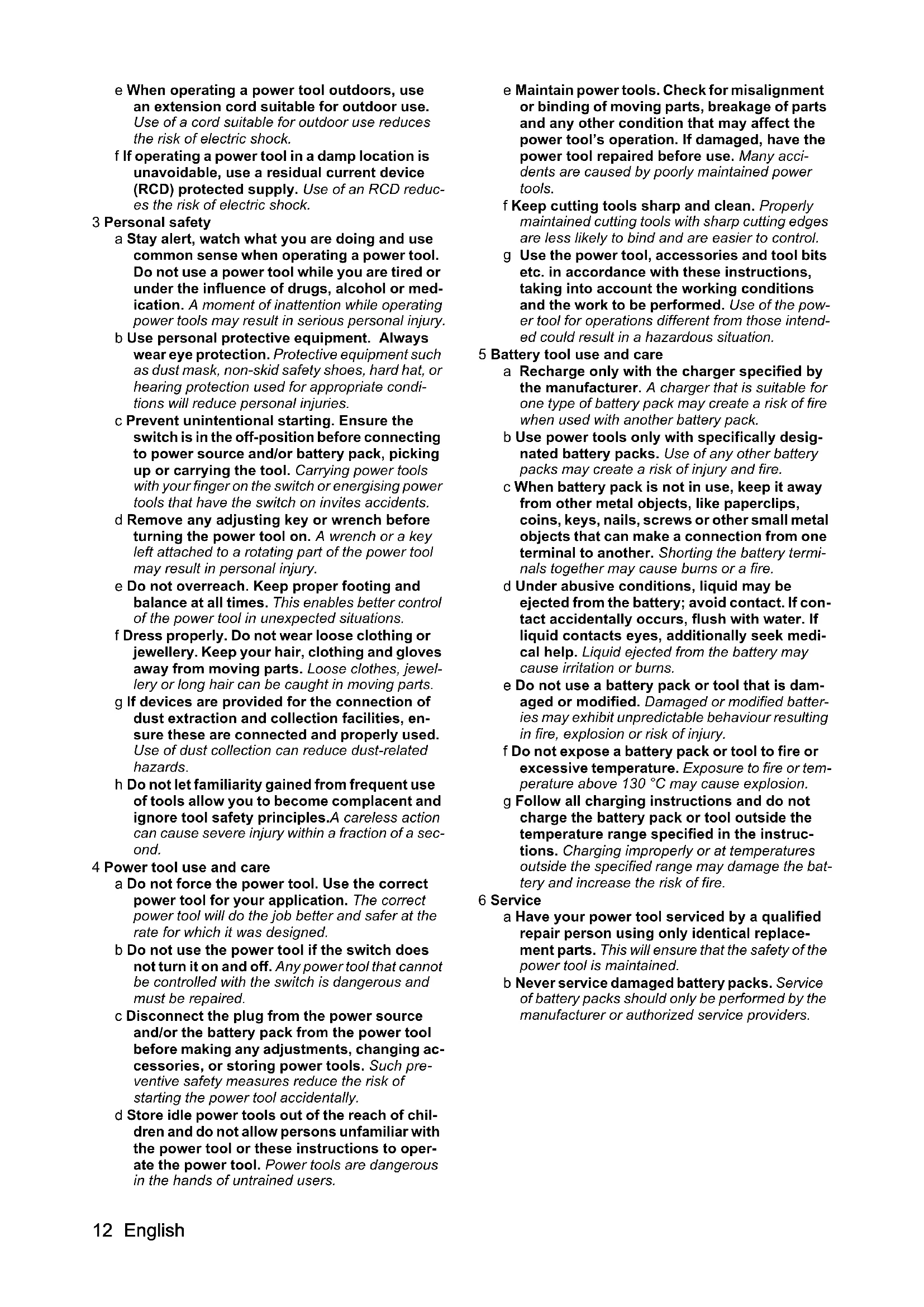 • EU Declaration of Conformity English e When operating a power tool outdoors, use an extension cord suitable for outdoor use. Use of a cord suitable for outdoor use reduces the risk of electric shock. f If operating a power tool in a damp location is unavoidable, use a residual current device (RCD) protected supply. Use of an RCD reduc- es the risk of electric shock. 3 Personal safety a Stay alert, watch what you are doing and use common sense when operating a power tool. Do not use a power tool while you are tired or under the influence of drugs, alcohol or med- ication. A moment of inattention while operating power tools may result in serious personal injury. b Use personal protective equipment. Always wear eye protection. Protective equipment such as dust mask, non-skid safety shoes, hard hat, or hearing protection used for appropriate condi- tions will reduce personal injuries. c Prevent unintentional starting. Ensure the switch is in the off-position before connecting to power source and/or battery pack, picking up or carrying the tool. Carrying power tools with your finger on the switch or energising power tools that have the switch on invites accidents. d Remove any adjusting key or wrench before turning the power tool on. A wrench or a key left attached to a rotating part of the power tool may result in personal injury. e Do not overreach. Keep proper footing and balance at all times. This enables better control of the power tool in unexpected situations. f Dress properly. Do not wear loose clothing or jewellery. Keep your hair, clothing and gloves away from moving parts. Loose clothes, jewel- lery or long hair can be caught in moving parts. g If devices are provided for the connection of dust extraction and collection facilities, en- sure these are connected and properly used. Use of dust collection can reduce dust-related hazards. h Do not let familiarity gained from frequent use of tools allow you to become complacent and ignore tool safety principles.A careless action can cause severe injury within a fraction of a sec- ond. 4 Power tool use and care a Do not force the power tool. Use the correct power tool for your application. The correct power tool will do the job better and safer at the rate for which it was designed. b Do not use the power tool if the switch does not turn it on and off. Any power tool that cannot be controlled with the switch is dangerous and must be repaired. c Disconnect the plug from the power source and/or the battery pack from the power tool before making any adjustments, changing ac- cessories, or storing power tools. Such pre- ventive safety measures reduce the risk of starting the power tool accidentally. d Store idle power tools out of the reach of chil- dren and do not allow persons unfamiliar with the power tool or these instructions to oper- ate the power tool. Power tools are dangerous in the hands of untrained users. e Maintain power tools. Check for misalignment or binding of moving parts, breakage of parts and any other condition that may affect the power tool’s operation. If damaged, have the power tool repaired before use. Many acci- dents are caused by poorly maintained power tools. f Keep cutting tools sharp and clean. Properly maintained cutting tools with sharp cutting edges are less likely to bind and are easier to control. p. 1712