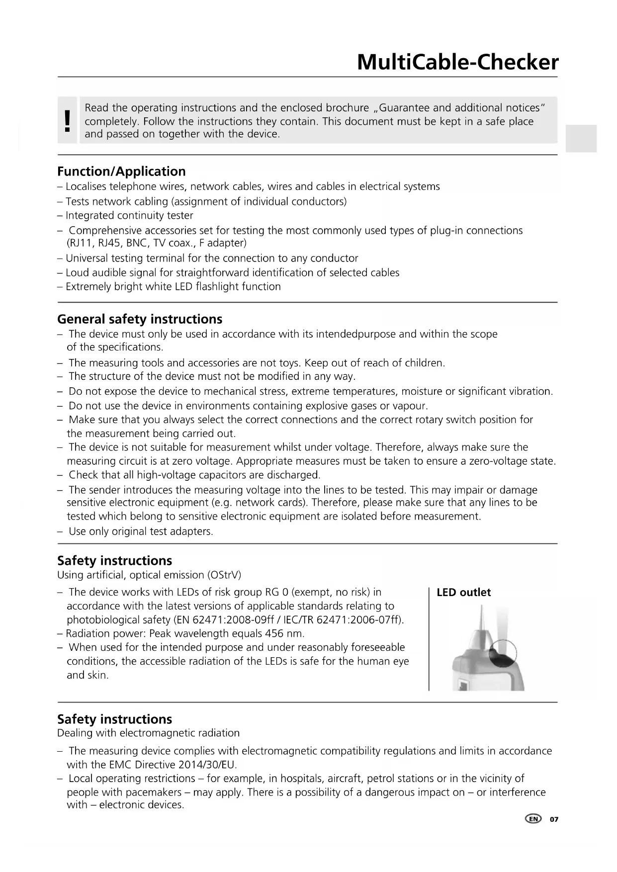 Function/Application – Localises telephone wires, network cables, wires and cables in electrical systems – Tests network cabling (assignment of individual conductors) – Integrated continuity tester – Comprehensive accessories set for testing the most commonly used types of plug-in connections (RJ11, RJ45, BNC, TV coax., F adapter) – Universal testing terminal for the connection to any conductor – Loud audible signal for straightforward identication of selected cables – Extremely bright white LED ashlight function General safety instructions – The device must only be used in accordance with its intendedpurpose and within the scope of the specications. – The measuring tools and accessories are not toys. Keep out of reach of children. – The structure of the device must not be modied in any way. – Do not expose the device to mechanical stress, extreme temperatures, moisture or signicant vibration. – Do not use the device in environments containing explosive gases or vapour. – Make sure that you always select the correct connections and the correct rotary switch position for the measurement being carried out. – The device is not suitable for measurement whilst under voltage. Therefore, always make sure the measuring circuit is at zero voltage. Appropriate measures must be taken to ensure a zero-voltage state. – Check that all high-voltage capacitors are discharged. – The sender introduces the measuring voltage into the lines to be tested. This may impair or damage sensitive electronic equipment (e.g. network cards). Therefore, please make sure that any lines to be tested which belong to sensitive electronic equipment are isolated before measurement. – Use only original test adapters. Safety instructions Using articial, optical emission (OStrV) Safety instructions Dealing with electromagnetic radiation – The device works with LEDs of risk group RG 0 (exempt, no risk) in accordance with the latest versions of applicable standards relating to photobiological safety (EN 62471:2008-09ff / IEC/TR 62471:2006-07ff). – Radiation power: Peak wavelength equals 456 nm. – When used for the intended purpose and under reasonably foreseeable conditions, the accessible radiation of the LEDs is safe for the human eye and skin. – The measuring device complies with electromagnetic compatibility regulations and limits in accordance with the EMC Directive 2014/30/EU. – Local operating restrictions – for example, in hospitals, aircraft, petrol stations or in the vicinity of people with pacemakers – may apply. There is a possibility of a dangerous impact on – or interference with – electronic devices. LED outlet EN08