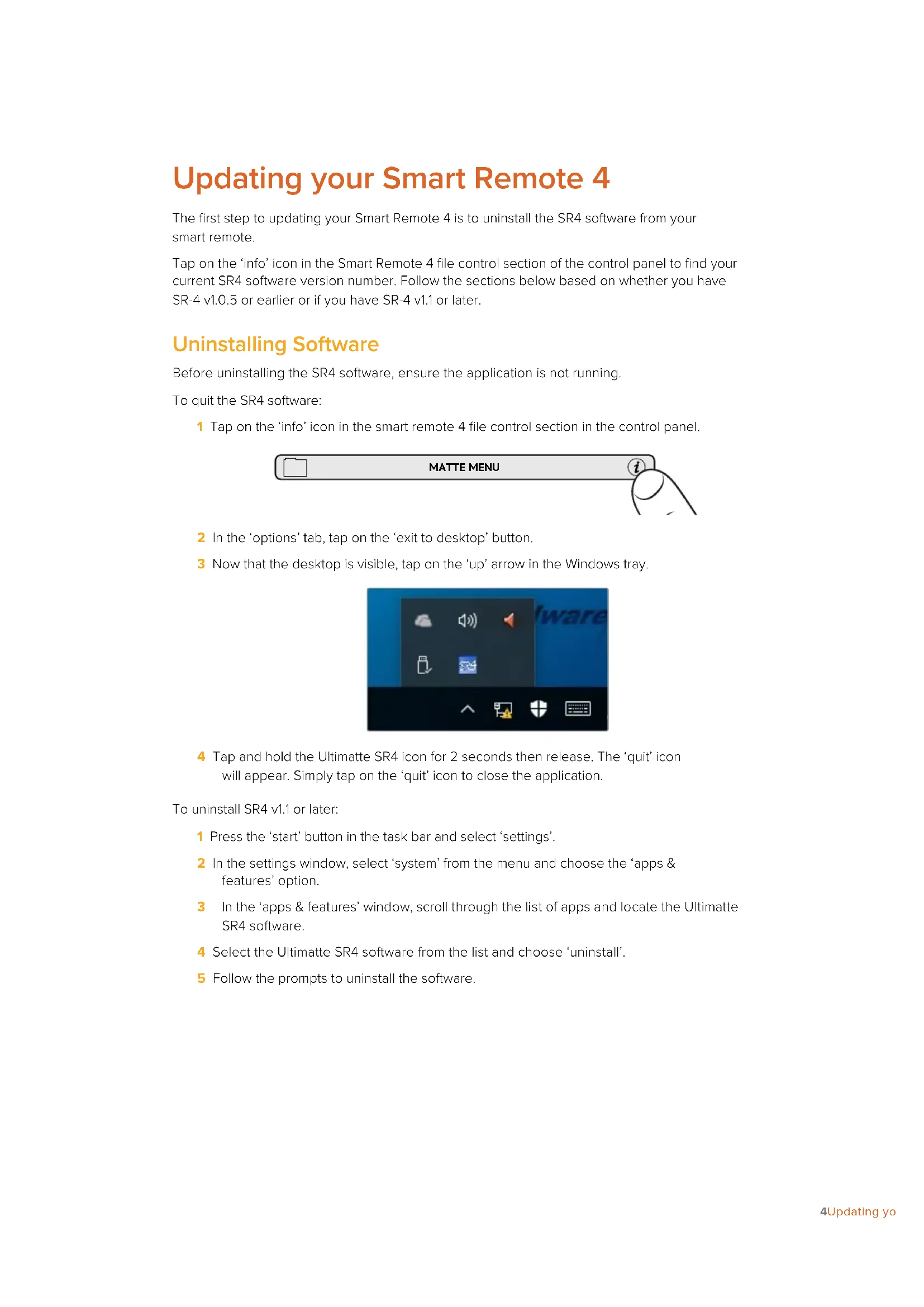 Updating your Smart Remote 4 4 Uninstalling Software 4 Installing Ultimatte Smart Remote Setup 6 Help 9 Regulatory Notices and SafetyInformation 10 Warranty 11 Ultimatte Smart Remote 4Updating your Smart Remote 4 The first step to updating your Smart Remote 4 is to uninstall the SR4 software from your smart remote. Tap on the ‘info’ icon in the Smart Remote 4 file control section of the control panel to find your current SR4 software version number. Follow the sections below based on whether you have SR-4 v1.0.5 or earlier or if you have SR-4v1.1 or later. Uninstalling Software Before uninstalling the SR4 software, ensure the application is not running. To quit the SR4 software: 1 Tap on the ‘info’ icon in the smart remote 4 file control section in the control panel. MATTE MENU 2 In the ‘options’ tab, tap on the ‘exit to desktop’ button. 3 Now that the desktop is visible, tap on the ‘up’ arrow in the Windows tray. 4 Tap and hold the Ultimatte SR4 icon for 2 seconds then release. The ‘quit’ icon willappear. Simply tap on the ‘quit’ icon to close the application. To uninstall SR4 v1.1 or later: 1 Press the ‘start’ button in the task bar and select ‘settings’. 2 In the settings window, select ‘system’ from the menu and choose the ‘apps & features’ option. 3 In the ‘apps & features’ window, scroll through the list of apps and locate the Ultimatte SR4 software. 4 Select the Ultimatte SR4 software from the list and choose ‘uninstall’. 5 Follow the prompts to uninstall the software. 4Updating your Smart Remote 4To uninstall SR4 v1.0.5 or earlier: 1 Tap and hold the Windows logo in the bottom left corner, then tap on ‘file explorer’. Tap and hold on the Windows logo, then tap file explorer 2 In file explorer, navigate to: C:\Program Files\Ultimatte\SR4, and double tap onthemaintenance application labelled, ‘maintenancetool.exe’ Browse ‘local disk C:\’ and double tap on the required folders to open their contents 5Updating your Smart Remote 43 On the maintenance application window, select ‘remove all components’ and tap ‘next’. Select ‘remove all components’ and tap ‘next’ 4 The maintenance application will now let you know it is ready to uninstall. Tap ‘uninstall’ and allow the application to make changes to your Smart Remote 4 by tapping ‘yes’. 5 Tap ‘finish’ on the ‘completing the smart remote wizard’ window. The Ultimatte Smart Remote 4 software has now been uninstalled. Installing Ultimatte Smart Remote Setup The first step is to download the latest Ultimatte Smart Remote 4 Setup software from the Blackmagic Design support center at www.blackmagicdesign.com/support. Copy and paste the Smart Remote .msi file onto a portable USB storage unit, for example a USB flash drive. Plug the USB drive into the USB port on the front of your Smart Remote 4. Smart Remote 4 will automatically read the USB drive and open the file explorer. NOTE The portable storage drive used to install the software on your smart remote must be formatted as the master boot record using one single partition. Your Smart Remote 4 recognizes NTFS, exFAT and FAT32 formats. 6Updating your Smart Remote 4To install the software: 1 Double tap on the smart remote installer icon in the storage drive. 2 Tawp ‘next’ in the setup wizard and follow the prompts until you reach the ‘install’ option. 3 Tap ‘install’ and allow the installer to make changes to your Smart Remote 4 by tapping ‘yes’ when prompted. 4 Tap ‘finish’ to complete the installation and ‘yes’ to restart your Smart Remote 4. Your Smart Remote 4 will restart and automatically launch the latest version of the Ultimatte Smart Remote 4 control panel. 7Updating your Smart Remote 45 A Windows dialogue box will appear prompting you to allow Smart Remote to communicate over a network. Select ‘private networks, such as my home or work network’ and tap ‘allow access’. 8Updating your Smart Remote 4Help Getting Help The fastest way to obtain help is to go to the Blackmagic Design online support pages and check the latest support material available for your Blackmagic Ultimatte or Smart Remote 4. Blackmagic Design online support pages The latest manual, software and support notes can be found at the Blackmagic Design support center at www.blackmagicdesign.com/support. Contacting Blackmagic Design support If you can’t find the help you need in our support material, please use the ‘Send us an email’ button on the support page to email a support request. Alternatively, click on the ‘Find your local support team’ button on the support page and call your nearest Blackmagic Design support office. Checking the version currently installed To check which version of Blackmagic Ultimatte Setup software is installed on your computer, launch Blackmagic Ultimatte Setup and click on the ‘about’ tab. The software version number will be displayed in the ‘software information’ section. How to get the latest updates After checking the version of Blackmagic Ultimatte Setup software installed on your computer, please visit the Blackmagic Design support center at www.blackmagicdesign.com/support to check for the latest updates. While it is usually a good idea to run the latest updates, it is a wise practice to avoid updating any software if you are in the middle of an important project. 9HelpRegulatory Notices and SafetyInformation Regulatory Notices Disposal of waste of electrical and electronic equipment within the European union. The symbol on the product indicates that this equipment must not be disposed of with other waste materials. In order to dispose of your waste equipment, it must be handed over to a designated collection point for recycling. The separate collection and recycling of your waste equipment at the time of disposal will help conserve natural resources and ensure that it is recycled in a manner that protects human health and the environment. Fo