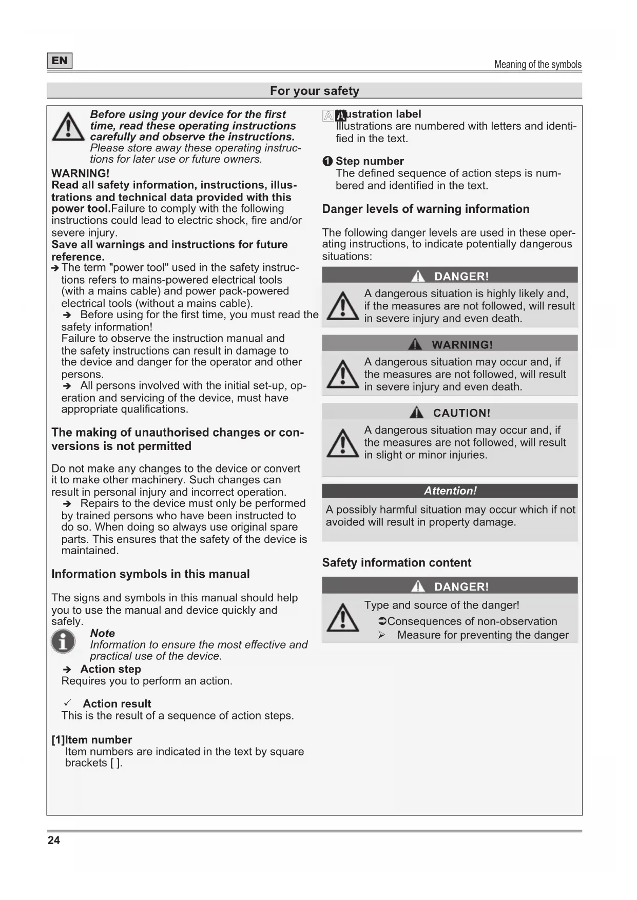For your safety Before using your device for the rst time, read these operating instructions carefully and observe the instructions. Please store away these operating instruc- tions for later use or future owners. WARNING! Read all safety information, instructions, illus- trations and technical data provided with this power tool.Failure to comply with the following instructions could lead to electric shock, re and/or severe injury. Save all warnings and instructions for future reference. Î The term "power tool" used in the safety instruc- tions refers to mains-powered electrical tools (with a mains cable) and power pack-powered electrical tools (without a mains cable). Î Before using for the rst time, you must read the safety information! Failure to observe the instruction manual and the safety instructions can result in damage to the device and danger for the operator and other persons. Î All persons involved with the initial set-up, op- eration and servicing of the device, must have appropriate qualications. The making of unauthorised changes or con- versions is not permitted Do not make any changes to the device or convert it to make other machinery. Such changes can result in personal injury and incorrect operation. Î Repairs to the device must only be performed by trained persons who have been instructed to do so. When doing so always use original spare parts. This ensures that the safety of the device is maintained. Information symbols in this manual The signs and symbols in this manual should help you to use the manual and device quickly and safely. Note Information to ensure the most eective and practical use of the device. Î Action step Requires you to perform an action. 3 Action result This is the result of a sequence of action steps. [1]Item number Item numbers are indicated in the text by square brackets [ ].