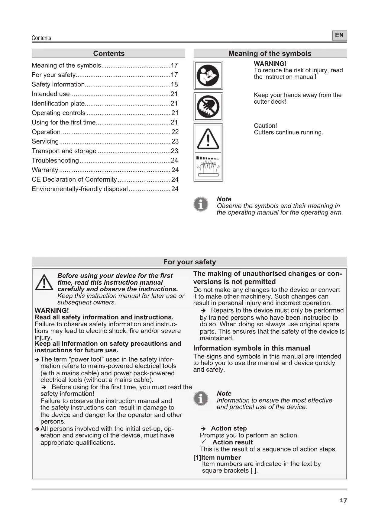 - Environmentally-friendly disposal Meaning of the symbols WARNING! To reduce the risk of injury, read the instruction manual! Keep your hands away from the cutter deck! Caution! Cutters continue running. Note Observe the symbols and their meaning in the operating manual for the operating arm. For your safety Before using your device for the rst time, read this instruction manual carefully and observe the instructions. Keep this instruction manual for later use or subsequent owners. WARNING! Read all safety information and instructions. Failure to observe safety information and instruc- tions may lead to electric shock, re and/or severe injury. Keep all information on safety precautions and instructions for future use. Î The term "power tool" used in the safety infor- mation refers to mains-powered electrical tools (with a mains cable) and power pack-powered electrical tools (without a mains cable). Î Before using for the rst time, you must read the safety information! Failure to observe the instruction manual and the safety instructions can result in damage to the device and danger for the operator and other persons. Î All persons involved with the initial set-up, op- eration and servicing of the device, must have appropriate qualications. The making of unauthorised changes or con- versions is not permitted Do not make any changes to the device or convert it to make other machinery. Such changes can result in personal injury and incorrect operation. Î Repairs to the device must only be performed by trained persons who have been instructed to do so. When doing so always use original spare parts. This ensures that the safety of the device is maintained. Information symbols in this manual The signs and symbols in this manual are intended to help you to use the manual and device quickly and safely. Note Information to ensure the most effective and practical use of the device. Î Action step Prompts you to perform an action. 3 Action result This is the result of a sequence of action steps. [1]Item number Item numbers are indicated in the text by square brackets [ ].For your safety p. 24