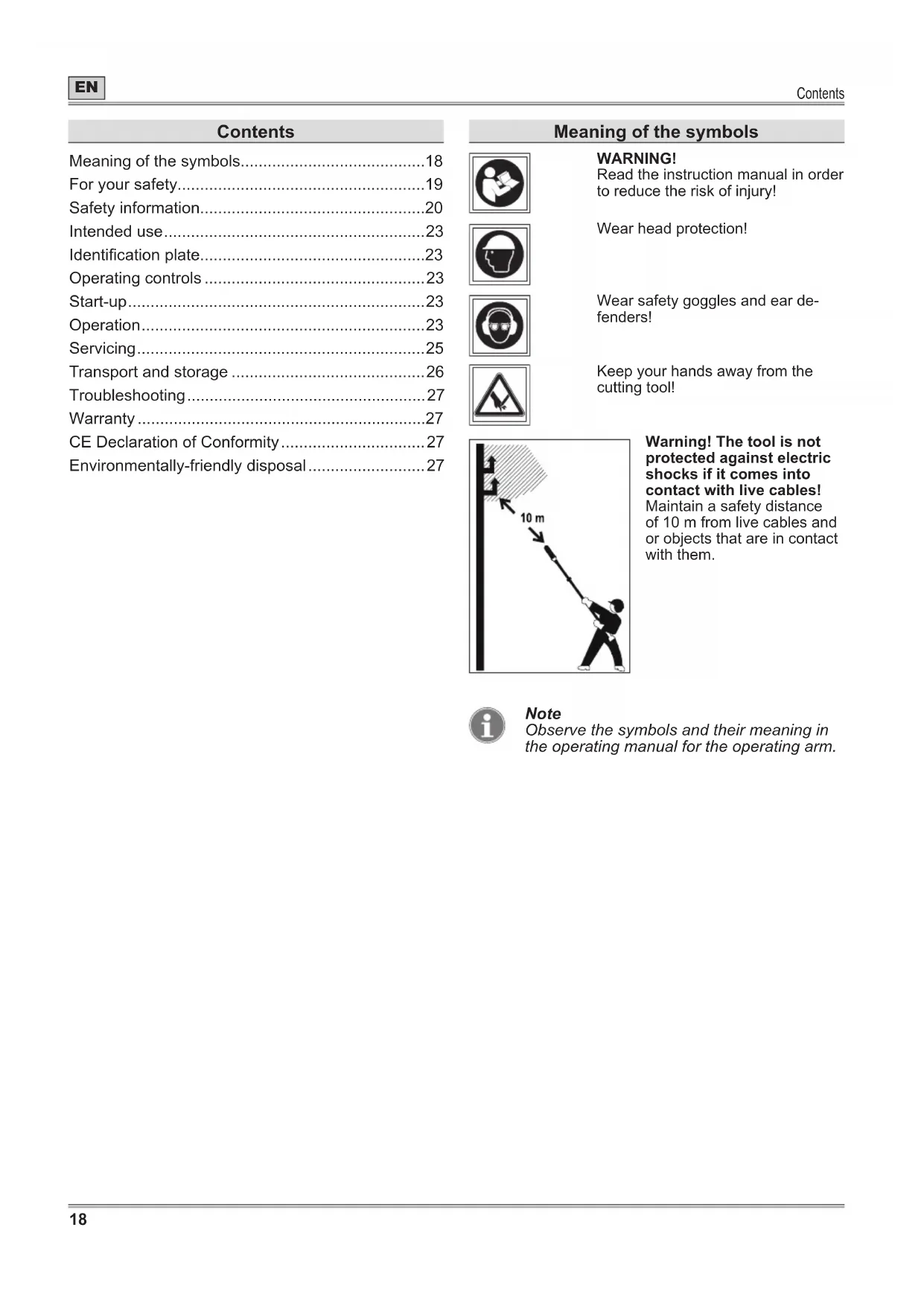 - Environmentally-friendly disposal Meaning of the symbols WARNING! Read the instruction manual in order to reduce the risk of injury! Wear head protection! Wear safety goggles and ear de- fenders! Keep your hands away from the cutting tool! Warning! The tool is not protected against electric shocks if it comes into contact with live cables! Maintain a safety distance of 10 m from live cables and or objects that are in contact with them. Note Observe the symbols and their meaning in the operating manual for the operating arm.Meaning of the symbols p. 27