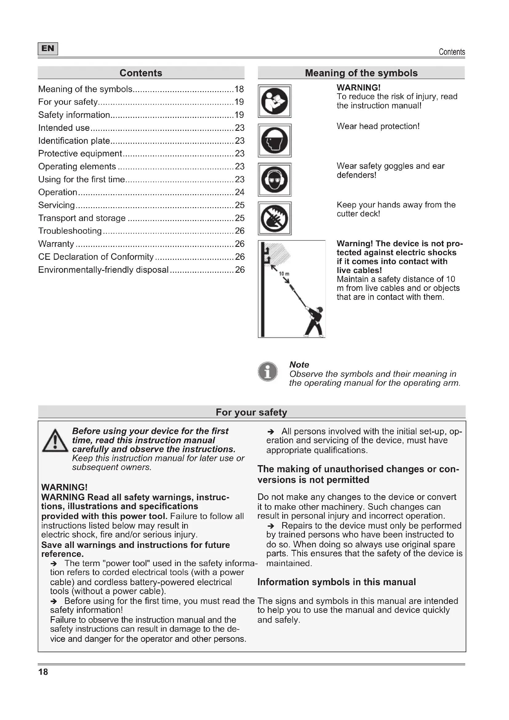 - Environmentally-friendly disposal Meaning of the symbols WARNING! To reduce the risk of injury, read the instruction manual! Wear head protection! Wear safety goggles and ear defenders! Keep your hands away from the cutter deck! Warning! The device is not pro- tected against electric shocks if it comes into contact with live cables! Maintain a safety distance of 10 m from live cables and or objects that are in contact with them. Note Observe the symbols and their meaning in the operating manual for the operating arm. For your safety Before using your device for the rst time, read this instruction manual carefully and observe the instructions. Keep this instruction manual for later use or subsequent owners. WARNING! WARNING Read all safety warnings, instruc- tions, illustrations and specications provided with this power tool. Failure to follow all instructions listed below may result in electric shock, re and/or serious injury. Save all warnings and instructions for future reference. Î The term "power tool" used in the safety informa- tion refers to corded electrical tools (with a power cable) and cordless battery-powered electrical tools (without a power cable). Î Before using for the rst time, you must read the safety information! Failure to observe the instruction manual and the safety instructions can result in damage to the de- vice and danger for the operator and other persons. Î All persons involved with the initial set-up, op- eration and servicing of the device, must have appropriate qualications. The making of unauthorised changes or con- versions is not permitted Do not make any changes to the device or convert it to make other machinery. Such changes can result in personal injury and incorrect operation. Î Repairs to the device must only be performed by trained persons who have been instructed to do so. When doing so always use original spare parts. This ensures that the safety of the device is maintained. Information symbols in this manual The signs and symbols in this manual are intended to help you to use the manual and device quickly and safely.For your safety p. 26