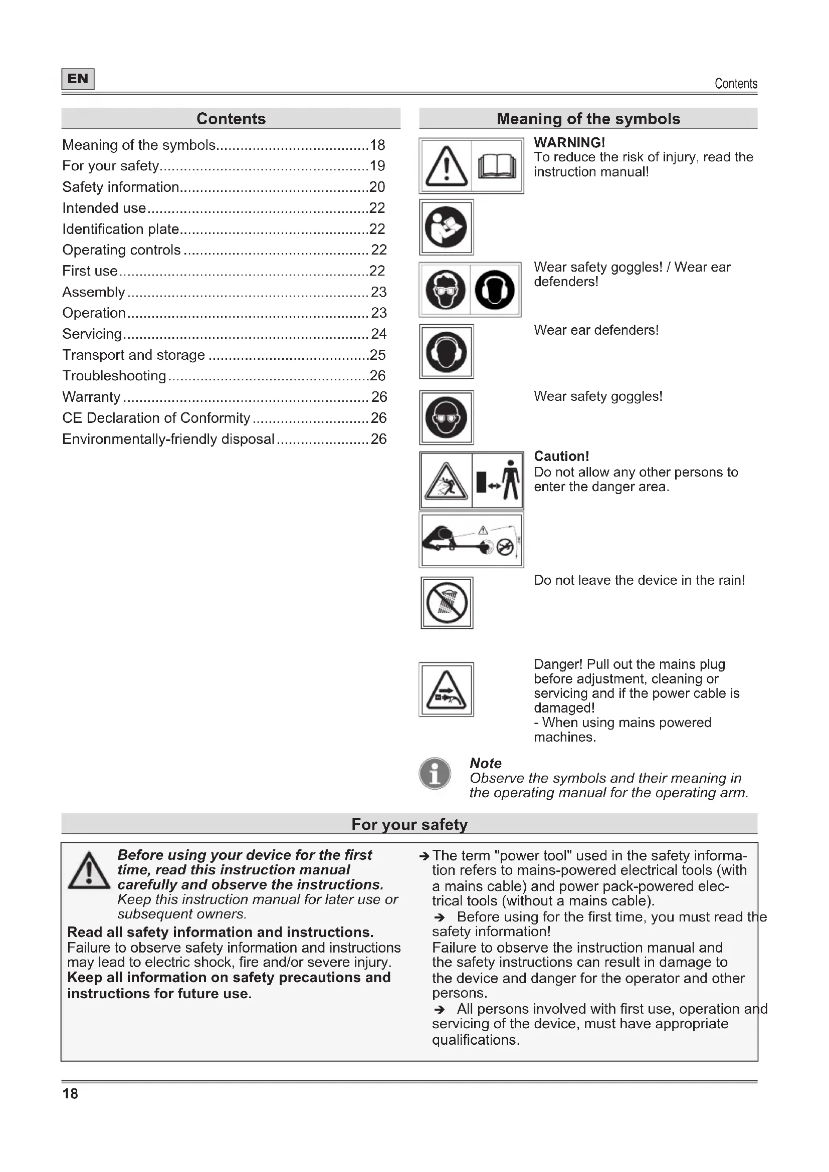 - Environmentally-friendly disposal Meaning of the symbols WARNING! To reduce the risk of injury, read the instruction manual! Wear safety goggles! / Wear ear defenders! Wear ear defenders! Wear safety goggles! Caution! Do not allow any other persons to enter the danger area. Do not leave the device in the rain! Danger! Pull out the mains plug before adjustment, cleaning or servicing and if the power cable is damaged! - When using mains powered machines. Note Observe the symbols and their meaning in the operating manual for the operating arm. For your safety Before using your device for the rst time, read this instruction manual carefully and observe the instructions. Keep this instruction manual for later use or subsequent owners. Read all safety information and instructions. Failure to observe safety information and instructions may lead to electric shock, re and/or severe injury. Keep all information on safety precautions and instructions for future use. Î The term "power tool" used in the safety informa- tion refers to mains-powered electrical tools (with a mains cable) and power pack-powered elec- trical tools (without a mains cable). Î Before using for the rst time, you must read the safety information! Failure to observe the instruction manual and the safety instructions can result in damage to the device and danger for the operator and other persons. Î All persons involved with rst use, operation and servicing of the device, must have appropriate qualications.For your safety p. 26