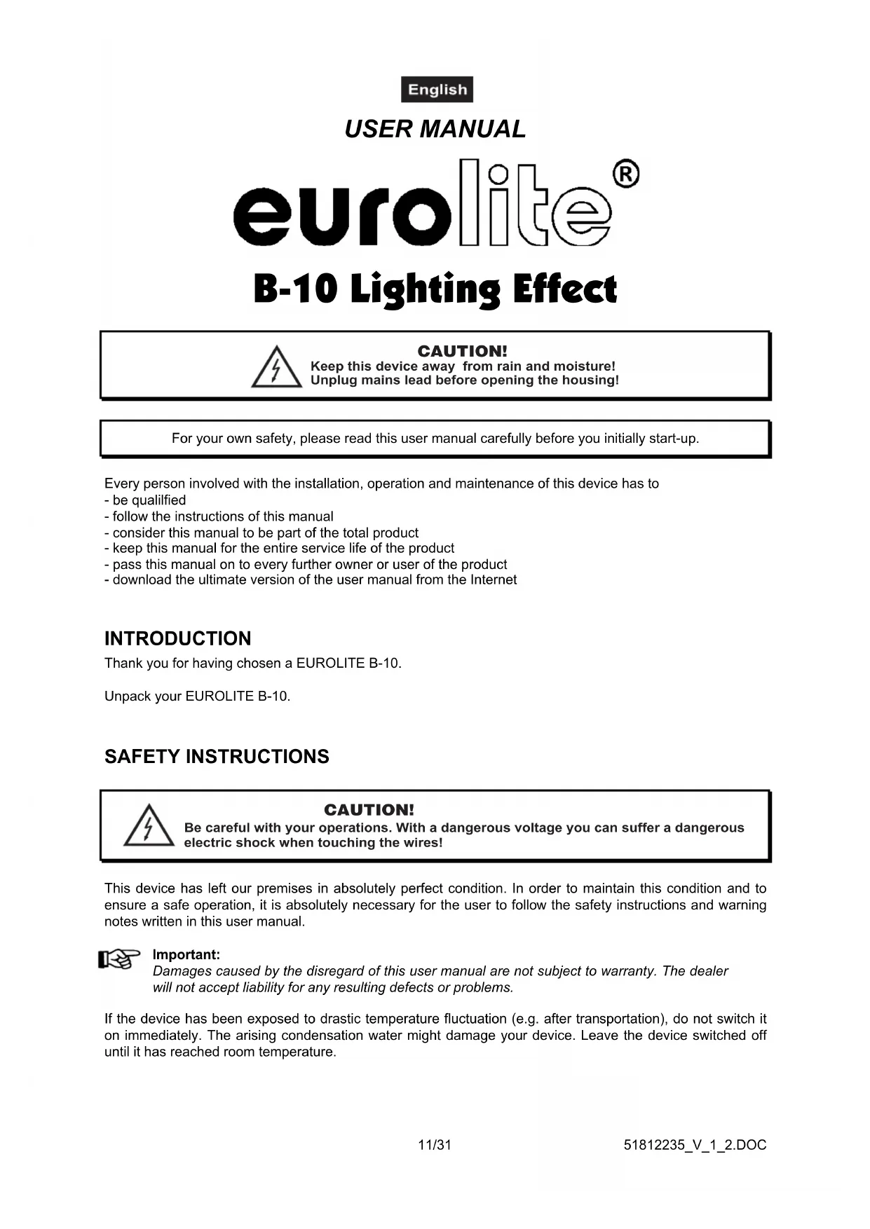 USER MANUAL B-10 Lighting Effect CAUTION! Keep this device away from rain and moisture! Unplug mains lead before opening the housing! For your own safety, please read this user manual carefully before you initially start-up.Every person involved with the installation, operation and maintenance of this device has to- be qualilfied- follow the instructions of this manual- consider this manual to be part of the total product- keep this manual for the entire service life of the product- pass this manual on to every further owner or user of the product- download the ultimate version of the user manual from the Internet INTRODUCTION Thank you for having chosen a EUROLITE B-10.Unpack your EUROLITE B-10. SAFETY INSTRUCTIONS CAUTION! Be careful with your operations. With a dangerous voltage you can suffer a dangerous electric shock when touching the wires! This device has left our premises in absolutely perfect condition. In order to maintain this condition and to ensure a safe operation, it is absolutely necessary for the user to follow the safety instructions and warning notes written in this user manual.Important:Damages caused by the disregard of this user manual are not subject to warranty. The dealerwill not accept liability for any resulting defects or problems. If the device has been exposed to drastic temperature fluctuation (e.g. after transportation), do not switch it on immediately. The arising condensation water might damage your device. Leave the device switched off until it has reached room temperature.51812235_V_1_2.DOC 12/31 Please make sure that there are no obvious transport damages. Should you notice any damages on the A/C connection cable or on the casing, do not take the device into operation and immediately consult your local dealer. This device falls under protection-class I. The power plug must only be plugged into a protection class I outlet. The voltage and frequency must exactly be the same as stated on the device. Wrong voltages or power outlets can lead to the destruction of the device and to mortal electrical shock. Always plug in the power plug last. The power plug must always be inserted without force. Make sure that the plug is tightly connected with the outlet. Never let the power-cord come into contact with other cables! Handle the power-cord and all connections with the mains with particular caution! Never touch them with wet hands, as this could lead to mortal electrical shock. Never modify, bend, strain mechanically, put pressure on, pull or heat up the power cord. Never operate next to sources of heat or cold. Disregard can lead to power cord damages, fire or mortal electrical shock. The cable insert or the female part in the device must never be strained. There must always be sufficient cable to the device. Otherwise, the cable may be damaged which may lead to mortal damage. Make sure that the power-cord is never crimped or damaged by sharp edges. Check the device and the power-cord from time to time. If extension cords are used, make sure that the core diameter is sufficient for the required power consumption of the device. All warnings concerning the power cords are also valid for possible extension cords. Always disconnect from the mains, when the device is not in use or before cleaning it. Only handle the power-cord by the plug. Never pull out the plug by tugging the power-cord. Otherwise, the cable or plug can be damaged leading to mortal electrical shock. If the power plug or the power switch is not accessible, the device must be disconnected via the mains. If the power plug or the device is dusty, the device must be taken out of operation, disconnected and then be cleaned with a dry cloth. Dust can reduce the insulation which may lead to mortal electrical shock. More severe dirt in and at the device should only be removed by a specialist. There must never enter any liquid into power outlets, extension cords or any holes in the housing of the device. If you suppose that also a minimal amount of liquid may have entered the device, it must immediately be disconnected. This is also valid, if the device was exposed to high humidity. Also if the device is still running, the device must be checked by a specialist if the liquid has reduced any insulation. Reduced insulation can cause mortal electrical shock. There must never be any objects entering into the device. This is especially valid for metal parts. If any metal parts like staples or coarse metal chips enter into the device, the device must be taken out of operation and disconnected immediately. Malfunction or short-circuits caused by metal parts may cause mortal injuries. During the initial start-up some smoke or smell may arise. This is a normal process and does not necessarily mean that the device is defective. Caution: During the operation, the housing becomes very hot. Do not switch the device on and off in short intervals as this would reduce the lamp’s life. HEALTH HAZARD! Never look directly into the light source, as sensitive persons may suffer an epileptic shock (especially meant for epileptics)!51812235_V_1_2.DOC 13/31 Keep away children and amateurs! Never leave this device running unattended. OPERATING DETERMINATIONS This device is a lighting effect for creating decorative effects. This product is only allowed to be operated with an alternating voltage of 230 V, 50 Hz and was designed for indoor use only. This device is designed for professional use, e.g. on stages, in discotheques, theatres etc. Lighting effects are not designed for permanent operation. Consistent operation breaks will ensure that the device will serve you for a long time without defects. The device must never be installed over areas, where persons may be seated or walk by. Do not shake the device. Avoid brute force when installing or operating the device. When choosing the installation-spot, please make sure that the device is not exposed to extreme heat, moisture or dust. There should not be any cables lying around.