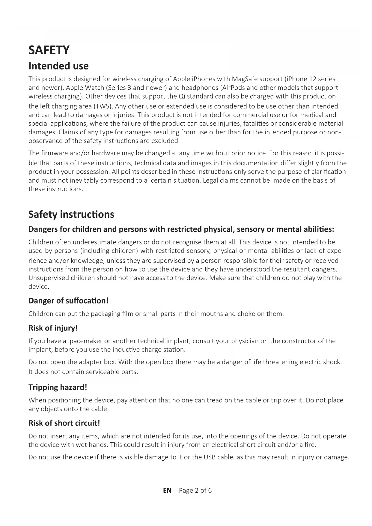 - Technical specicaons EN - Page 1 of 6 *Trademarks: Apple, MagSafe, Apple Watch, Air Pods and iPhone are registered trademarks of Apple Inc. All third-party trademarks and names are the property of their respective owners.EN - Page 1 of 6 SAFETY Intended use This product is designed for wireless charging of Apple iPhones with MagSafe support (iPhone 12 series and newer), Apple Watch (Series 3 and newer) and headphones (AirPods and other models that support wireless charging). Other devices that support the Qi standard can also be charged with this product on the le charging area (TWS). Any other use or extended use is considered to be use other than intended and can lead to damages or injuries. This product is not intended for commercial use or for medical and special applicaons, where the failure of the product can cause injuries, fatalies or considerable material damages. Claims of any type for damages resulng from use other than for the intended purpose or non- observance of the safety instrucons are excluded. The rmware and/or hardware may be changed at any me without prior noce. For this reason it is possi- ble that parts of these instrucons, technical data and images in this documentaon dier slightly from the product in your possession. All points described in these instrucons only serve the purpose of claricaon and must not inevitably correspond to a certain situaon. Legal claims cannot be made on the basis of these instrucons. Safety instrucons Dangers for children and persons with restricted physical, sensory or mental abilies: Children oen underesmate dangers or do not recognise them at all. This device is not intended to be used by persons (including children) with restricted sensory, physical or mental abilies or lack of expe- rience and/or knowledge, unless they are supervised by a person responsible for their safety or received instrucons from the person on how to use the device and they have understood the resultant dangers. Unsupervised children should not have access to the device. Make sure that children do not play with the device. Danger of suocaon! Children can put the packaging lm or small parts in their mouths and choke on them. Risk of injury! If you have a pacemaker or another technical implant, consult your physician or the constructor of the implant, before you use the inducve charge staon. Do not open the adapter box. With the open box there may be a danger of life threatening electric shock. It does not contain serviceable parts. Tripping hazard! When posioning the device, pay aenon that no one can tread on the cable or trip over it. Do not place any objects onto the cable. Risk of short circuit! Do not insert any items, which are not intended for its use, into the openings of the device. Do not operate the device with wet hands. This could result in injury from an electrical short circuit and/or a re. Do not use the device if there is visible damage to it or the USB cable, as this may result in injury or damage. EN - Page 2 of 6Do not expose the device to splashing or dripping water. Vessels lled with liquids (vases, glasses or similar) must not be placed on the device or near it. There is a risk that the container will p over and the liquid will aect the electrical safety. It is normal that during the use the device produces heat. Do not completely cover the product during use to avoid overheang. Damage! Keep the device away from any type of moisture and avoid dust, heat and direct sunlight. Do not use water or chemical soluons to clean the device. Only use a dry cloth for this purpose. Do not open the housing of the device and do not disassemble it into its component parts. Do not try to repair it yourself. The guarantee expires in this case. Avoid hard impacts to the device. Operate the adapter only on earthed sockets with AC 100-240V~, 50/60 Hz. If the power supply is not safe at the installaon site, ask the competent power supplier. To interrupt the power supply of your device, disconnect the power supply from the power socket. When disconnecng, always hold the adapter. Never pull the cable. Declaraon of conformity The CE marking says that this product meets the requirements of all EU Direcves applicable for this product. The UKCA marking says, that this product meets the requirements of all UK Direcves applicable for this product. Simplied declaraon of conformity Intenso Internaonal hereby declares that the Wireless Charger MB13 complies with Direcve 2014/53/EU. The full text of the EU Declaraon of Conformity is available at the following internet address: www.intenso.eu. p. 6