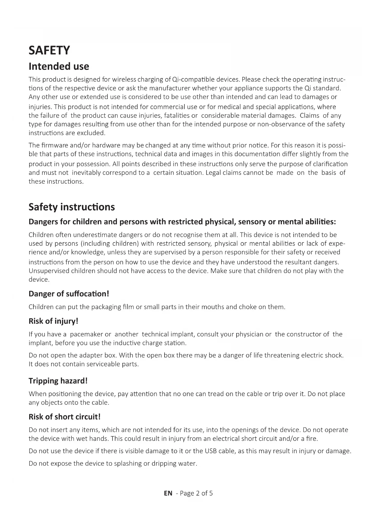 - Technical specicaons EN - Page 1 of 5SAFETY Intended use This product is designed for wireless charging of Qi-compable devices. Please check the operang instruc- ons of the respecve device or ask the manufacturer whether your appliance supports the Qi standard. Any other use or extended use is considered to be use other than intended and can lead to damages or injuries. This product is not intended for commercial use or for medical and special applicaons, where the failure of the product can cause injuries, fatalies or considerable material damages. Claims of any type for damages resulng from use other than for the intended purpose or non-observance of the safety instrucons are excluded. The rmware and/or hardware may be changed at any me without prior noce. For this reason it is possi- ble that parts of these instrucons, technical data and images in this documentaon dier slightly from the product in your possession. All points described in these instrucons only serve the purpose of claricaon and must not inevitably correspond to a certain situaon. Legal claims cannot be made on the basis of these instrucons. Safety instrucons Dangers for children and persons with restricted physical, sensory or mental abilies: Children oen underesmate dangers or do not recognise them at all. This device is not intended to be used by persons (including children) with restricted sensory, physical or mental abilies or lack of expe- rience and/or knowledge, unless they are supervised by a person responsible for their safety or received instrucons from the person on how to use the device and they have understood the resultant dangers. Unsupervised children should not have access to the device. Make sure that children do not play with the device. Danger of suocaon! Children can put the packaging lm or small parts in their mouths and choke on them. Risk of injury! If you have a pacemaker or another technical implant, consult your physician or the constructor of the implant, before you use the inducve charge staon. Do not open the adapter box. With the open box there may be a danger of life threatening electric shock. It does not contain serviceable parts. Tripping hazard! When posioning the device, pay aenon that no one can tread on the cable or trip over it. Do not place any objects onto the cable. Risk of short circuit! Do not insert any items, which are not intended for its use, into the openings of the device. Do not operate the device with wet hands. This could result in injury from an electrical short circuit and/or a re. Do not use the device if there is visible damage to it or the USB cable, as this may result in injury or damage. Do not expose the device to splashing or dripping water. EN - Page 2 of 5Vessels lled with liquids (vases, glasses or similar) must not be placed on the device or near it. There is a risk that the container will p over and the liquid will aect the electrical safety. It is normal that during the use the device produces heat. Do not completely cover the product during use to avoid overheang. Damage! Keep the device away from any type of moisture and avoid dust, heat and direct sunlight. Do not use water or chemical soluons to clean the device. Only use a dry cloth for this purpose. Do not open the housing of the device and do not disassemble it into its component parts. Do not try to repair it yourself. The guarantee expires in this case. Avoid hard impacts to the device. Operate the adapter only on earthed sockets with AC 100-240V~, 50/60 Hz. If the power supply is not safe at the installaon site, ask the competent power supplier. To interrupt the power supply of your device, disconnect the power supply from the power socket. When disconnecng, always hold the adapter. Never pull the cable. Declaraon of conformity The CE marking says that this product meets the requirements of all EU Direcves applicable for this product. The UKCA marking says, that this product meets the requirements of all UK Direcves applicable for this product. Simplied declaraon of conformity Intenso Internaonal hereby declares that the Wireless Charger BSA2 complies with Direcve 2014/53/EU. The full text of the EU Declaraon of Conformity is available at the following internet address: www.intenso.eu. p. 5