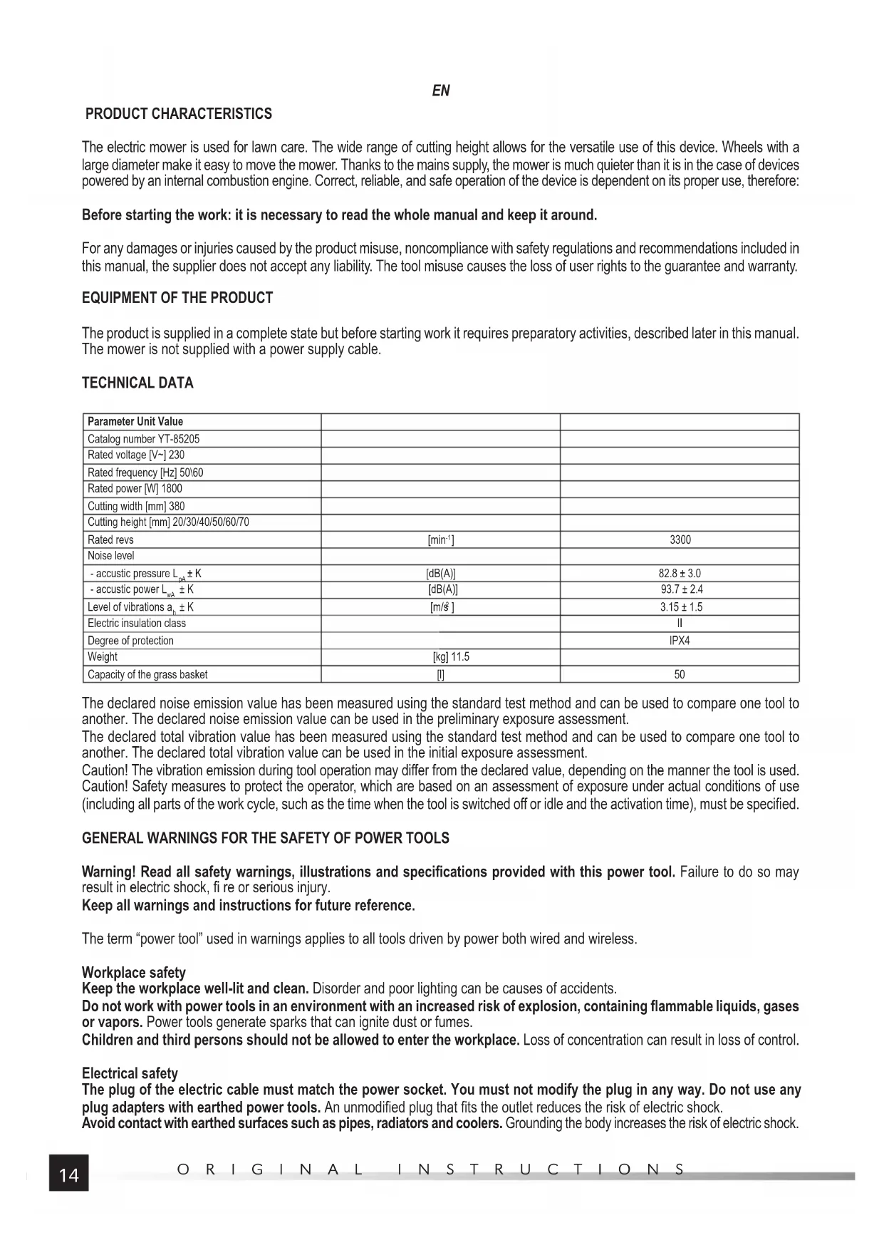 The product is supplied in a complete state but before starting work it requires preparatory activities, described later in this manual. The mower is not supplied with a power supply cable. TECHNICAL DATA Parameter Unit Value Catalog number YT-85205 Rated voltage [V~] 230 Rated frequency [Hz] 50\60 Rated power [W] 1800 Cutting width [mm] 380 Cutting height [mm] 20/30/40/50/60/70 Rated revs [min