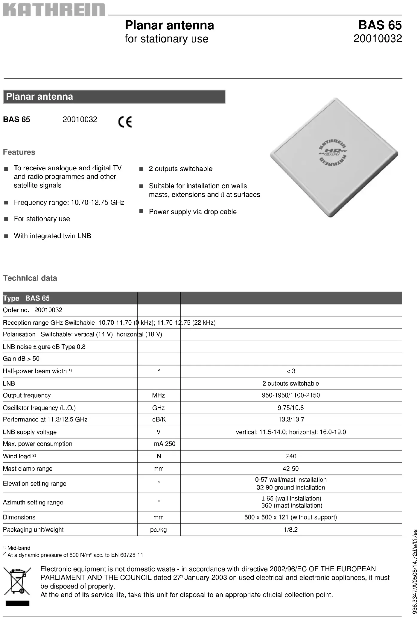 January 2003 on used electrical and electronic appliances, it must be disposed of properly. At the end of its service life, take this unit for disposal to an appropriate offi cial collection point. Technical data Type BAS 65 Order no. 20010032Reception range GHz Switchable: 10.70-11.70 (0 kHz); 11.70-12.75 (22 kHz)Polarisation Switchable: vertical (14 V); horizontal (18 V)LNB noise fi gure dB Type 0.8Gain dB > 50Half-power beam width ¹ °< 3LNB 2 outputs switchableOutput frequency MHz 950-1950/1100-2150Oscillator frequency (L.O.) GHz 9.75/10.6Performance at 11.3/12.5 GHz dB/K 13.3/13.7LNB supply voltage V vertical: 11.5-14.0; horizontal: 16.0-19.0Max. power consumption mA 250Wind load ² N 240Mast clamp range mm 42-50Elevation setting range °0-57 wall/mast installation32-90 ground installationAzimuth setting range °± 65 (wall installation)360 (mast installation)Dimensions mm 500 x 500 x 121 (without support)Packaging unit/weight pc./kg 1/8.2 Planar antenna BAS 65 20010032