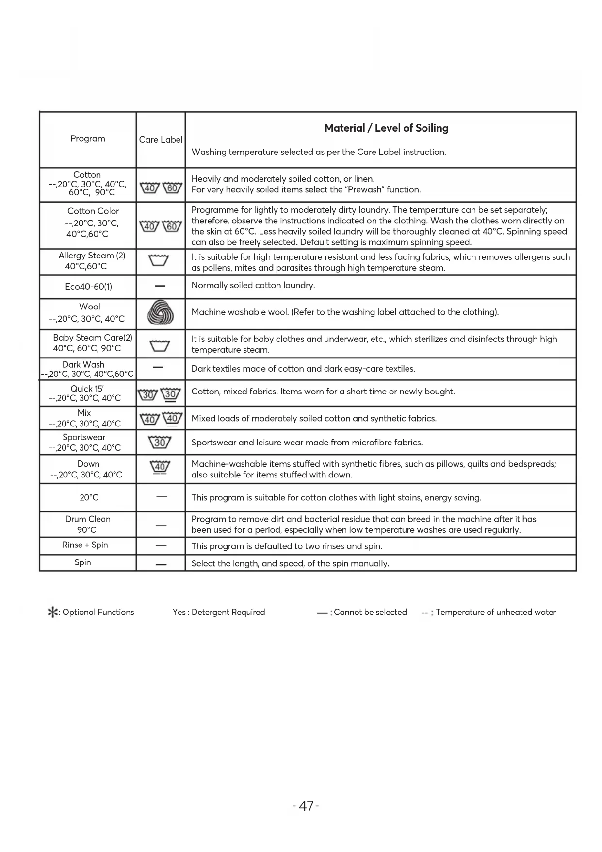 This washing machine is equipped with automatic safety functions which detect and diagnose at an early stage and react appropriately. Hold 3 sec to save program.Allergy SteamBaby Steam CareDark WashSportswear Down 20°C Drum Clean Off Spin CottonCotton ColorEco 40-60 Mix Wool Quick 15‘Rinse + Spin Temp. Favourite Options Delay End Start/PauseSpin A. Program selectorB. Program and function status display window C. “Temp.” buttonD. “Spin” buttonE. “Favourite” buttonF. “Options“ buttonG. “Delay End” button H. “Start/Pause” button I. Child Lock Function J. Mute Function QUICK USER MANUALCotton --,20°C, 30°C, 40°C, 60°C, 90°C Program Care Label Material / Level of Soiling Washing temperature selected as per the Care Label instruction. Cotton Color --,20°C, 30°C, 40°C,60°C Allergy Steam (2) 40°C,60°C Eco40-60(1) Wool --,20°C, 30°C, 40°C Baby Steam Care(2) 40°C, 60°C, 90°C Dark Wash --,20°C, 30°C, 40°C,60°C Quick 15’ --,20°C, 30°C, 40°C Mix --,20°C, 30°C, 40°C Sportswear --,20°C, 30°C, 40°C Down --,20°C, 30°C, 40°C 20°C Drum Clean 90°C Rinse + Spin Spin Heavily and moderately soiled cotton, or linen. For very heavily soiled items select the "Prewash" function. Programme for lightly to moderately dirty laundry. The temperature can be set separately; therefore, observe the instructions indicated on the clothing. Wash the clothes worn directly on the skin at 60°C. Less heavily soiled laundry will be thoroughly cleaned at 40°C. Spinning speed can also be freely selected. Default setting is maximum spinning speed. It is suitable for high temperature resistant and less fading fabrics, which removes allergens such as pollens, mites and parasites through high temperature steam. Normally soiled cotton laundry. Machine washable wool. (Refer to the washing label attached to the clothing). It is suitable for baby clothes and underwear, etc., which sterilizes and disinfects through high temperature steam. Dark textiles made of cotton and dark easy-care textiles. Cotton, mixed fabrics. Items worn for a short time or newly bought. Mixed loads of moderately soiled cotton and synthetic fabrics. Sportswear and leisure wear made from microfibre fabrics. Machine-washable items stuffed with synthetic fibres, such as pillows, quilts and bedspreads; also suitable for items stuffed with down. This program is suitable for cotton clothes with light stains, energy saving. Program to remove dirt and bacterial residue that can breed in the machine after it has been used for a period, especially when low temperature washes are used regularly. This program is defaulted to two rinses and spin. Select the length, and speed, of the spin manually. : Optional Functions Yes : Detergent Required Cannot be selected Temperature of unheated water