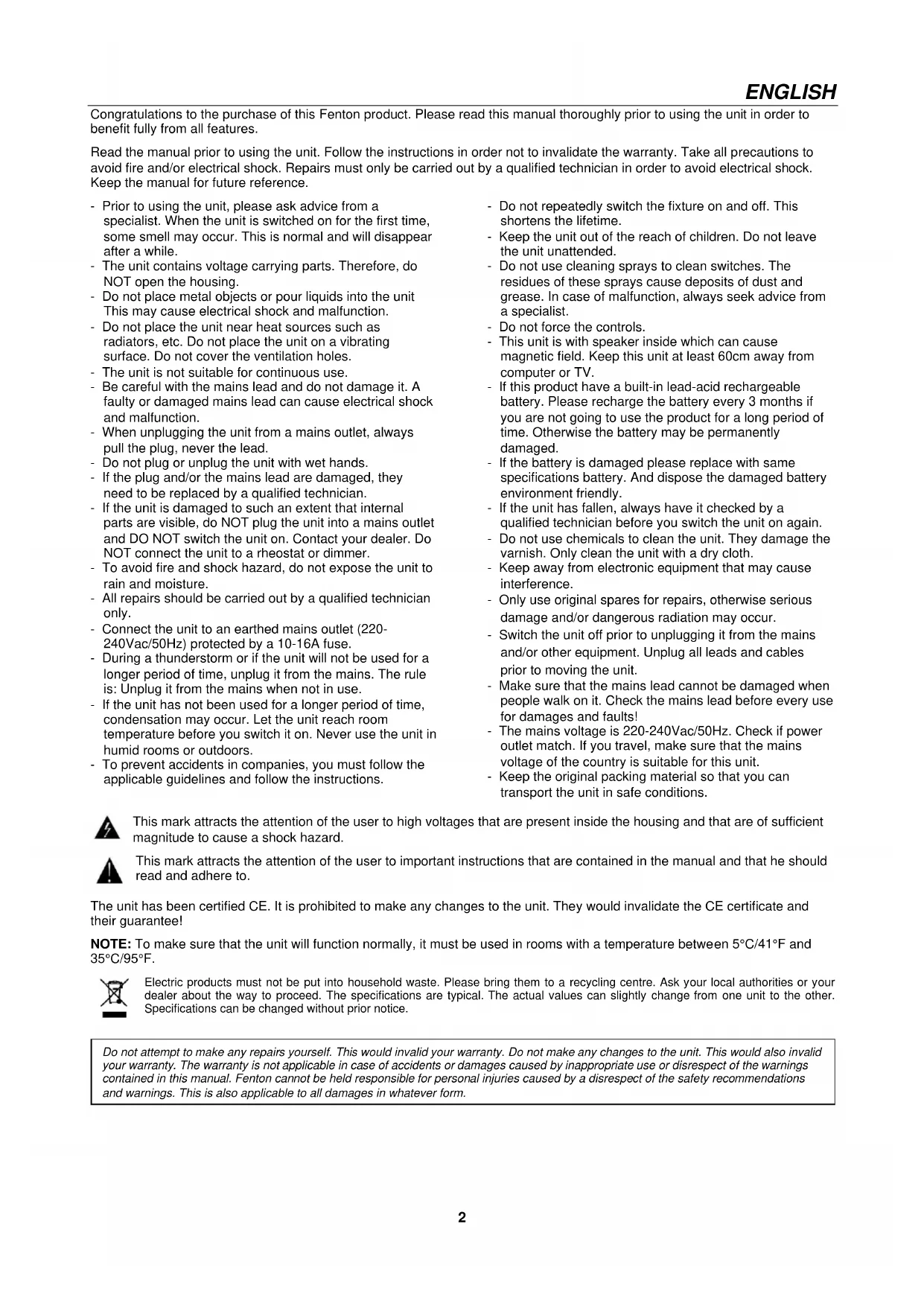 V1.32 ENGLISH Congratulations to the purchase of this Fenton product. Please read this manual thoroughly prior to using the unit in order to benefit fully from all features. Read the manual prior to using the unit. Follow the instructions in order not to invalidate the warranty. Take all precautions to avoid fire and/or electrical shock. Repairs must only be carried out by a qualified technician in order to avoid electrical shock. Keep the manual for future reference. - Prior to using the unit, please ask advice from a specialist. When the unit is switched on for the first time, some smell may occur. This is normal and will disappear after a while. - The unit contains voltage carrying parts. Therefore, do NOT open the housing. - Do not place metal objects or pour liquids into the unit This may cause electrical shock and malfunction. - Do not place the unit near heat sources such as radiators, etc. Do not place the unit on a vibrating surface. Do not cover the ventilation holes. - The unit is not suitable for continuous use. - Be careful with the mains lead and do not damage it. A faulty or damaged mains lead can cause electrical shock and malfunction. - When unplugging the unit from a mains outlet, always pull the plug, never the lead. - Do not plug or unplug the unit with wet hands. - If the plug and/or the mains lead are damaged, they need to be replaced by a qualified technician. - If the unit is damaged to such an extent that internal parts are visible, do NOT plug the unit into a mains outlet and DO NOT switch the unit on. Contact your dealer. Do NOT connect the unit to a rheostat or dimmer. - To avoid fire and shock hazard, do not expose the unit to rain and moisture. - All repairs should be carried out by a qualified technician only. - Connect the unit to an earthed mains outlet (220- 240Vac/50Hz) protected by a 10-16A fuse. - During a thunderstorm or if the unit will not be used for a longer period of time, unplug it from the mains. The rule is: Unplug it from the mains when not in use. - If the unit has not been used for a longer period of time, condensation may occur. Let the unit reach room temperature before you switch it on. Never use the unit in humid rooms or outdoors. - To prevent accidents in companies, you must follow the applicable guidelines and follow the instructions. - Do not repeatedly switch the fixture on and off. This shortens the lifetime. - Keep the unit out of the reach of children. Do not leave the unit unattended. - Do not use cleaning sprays to clean switches. The residues of these sprays cause deposits of dust and grease. In case of malfunction, always seek advice from a specialist. - Do not force the controls. - This unit is with speaker inside which can cause magnetic field. Keep this unit at least 60cm away from computer or TV. - If this product have a built-in lead-acid rechargeable battery. Please recharge the battery every 3 months if you are not going to use the product for a long period of time. Otherwise the battery may be permanently damaged. - If the battery is damaged please replace with same specifications battery. And dispose the damaged battery environment friendly. - If the unit has fallen, always have it checked by a qualified technician before you switch the unit on again. - Do not use chemicals to clean the unit. They damage the varnish. Only clean the unit with a dry cloth. - Keep away from electronic equipment that may cause interference. - Only use original spares for repairs, otherwise serious damage and/or dangerous radiation may occur. - Switch the unit off prior to unplugging it from the mains and/or other equipment. Unplug all leads and cables prior to moving the unit. - Make sure that the mains lead cannot be damaged when people walk on it. Check the mains lead before every use for damages and faults! - The mains voltage is 220-240Vac/50Hz. Check if power outlet match. If you travel, make sure that the mains voltage of the country is suitable for this unit. - Keep the original packing material so that you can transport the unit in safe conditions. This mark attracts the attention of the user to high voltages that are present inside the housing and that are of sufficient magnitude to cause a shock hazard. This mark attracts the attention of the user to important instructions that are contained in the manual and that he should read and adhere to. The unit has been certified CE. It is prohibited to make any changes to the unit. They would invalidate the CE certificate and their guarantee! NOTE: To make sure that the unit will function normally, it must be used in rooms with a temperature between 5°C/41°F and 35°C/95°F. Electric products must not be put into household waste. Please bring them to a recycling centre. Ask your local authorities or your dealer about the way to proceed. The specifications are typical. The actual values can slightly change from one unit to the other. Specifications can be changed without prior notice.