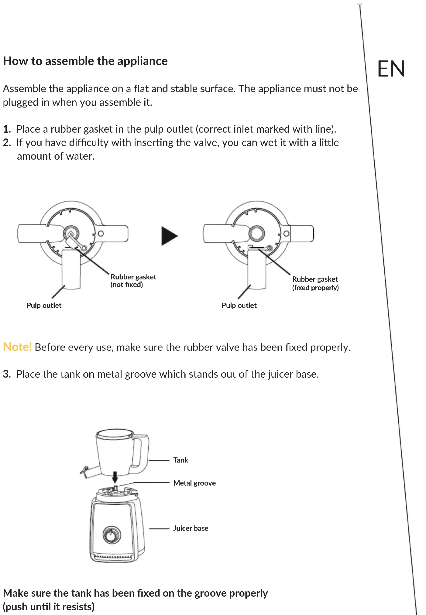 amount of water. Pulp outlet Rubber gasket (not xed) Pulp outlet Rubber gasket (xed properly) Note! Before every use, make sure the rubber valve has been xed properly.