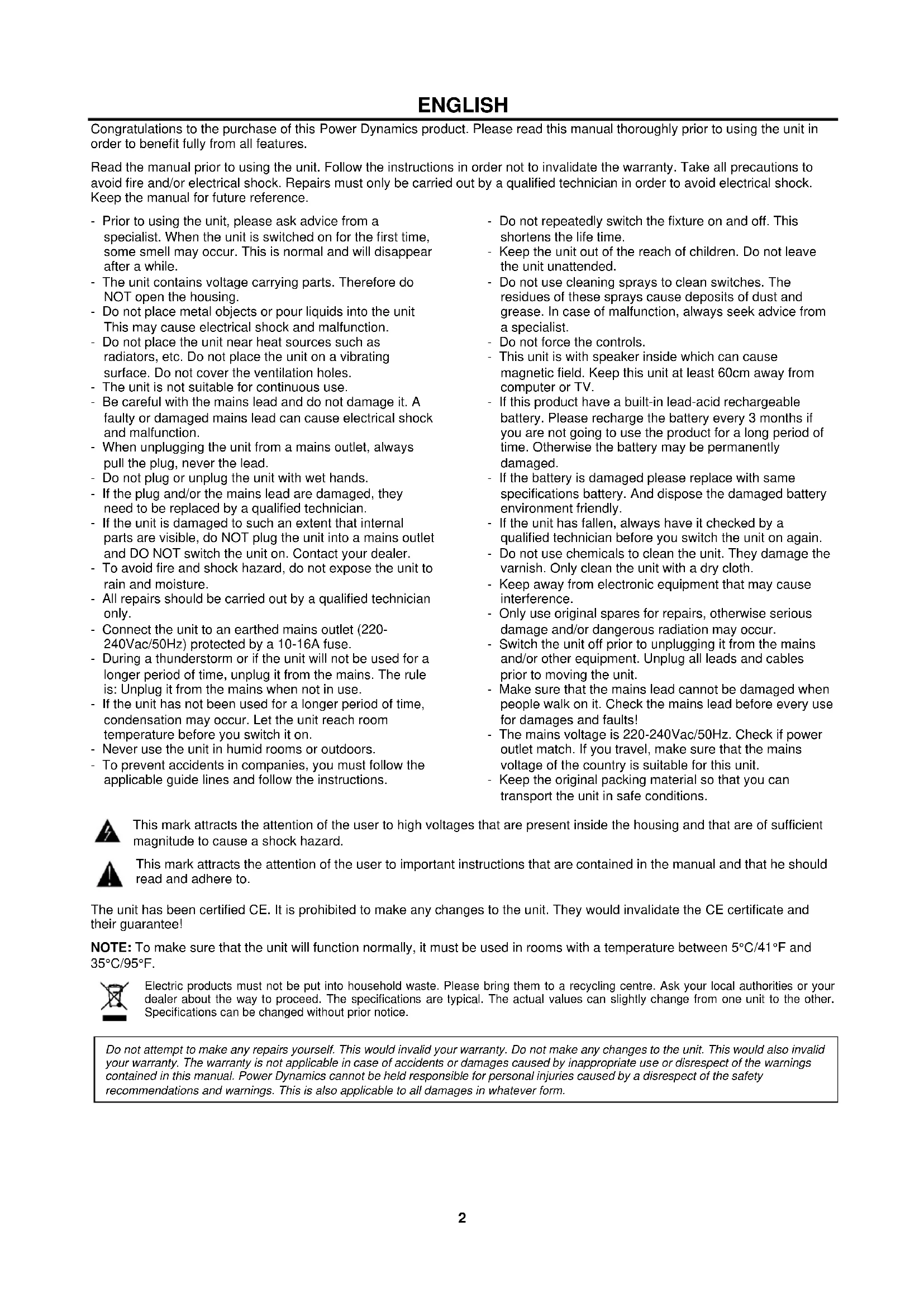 V1.22 ENGLISH Congratulations to the purchase of this Power Dynamics product. Please read this manual thoroughly prior to using the unit in order to benefit fully from all features. Read the manual prior to using the unit. Follow the instructions in order not to invalidate the warranty. Take all precautions to avoid fire and/or electrical shock. Repairs must only be carried out by a qualified technician in order to avoid electrical shock. Keep the manual for future reference. - Prior to using the unit, please ask advice from a specialist. When the unit is switched on for the first time, some smell may occur. This is normal and will disappear after a while. - The unit contains voltage carrying parts. Therefore do NOT open the housing. - Do not place metal objects or pour liquids into the unit This may cause electrical shock and malfunction. - Do not place the unit near heat sources such as radiators, etc. Do not place the unit on a vibrating surface. Do not cover the ventilation holes. - The unit is not suitable for continuous use. - Be careful with the mains lead and do not damage it. A faulty or damaged mains lead can cause electrical shock and malfunction. - When unplugging the unit from a mains outlet, always pull the plug, never the lead. - Do not plug or unplug the unit with wet hands. - If the plug and/or the mains lead are damaged, they need to be replaced by a qualified technician. - If the unit is damaged to such an extent that internal parts are visible, do NOT plug the unit into a mains outlet and DO NOT switch the unit on. Contact your dealer. - To avoid fire and shock hazard, do not expose the unit to rain and moisture. - All repairs should be carried out by a qualified technician only. - Connect the unit to an earthed mains outlet (220- 240Vac/50Hz) protected by a 10-16A fuse. - During a thunderstorm or if the unit will not be used for a longer period of time, unplug it from the mains. The rule is: Unplug it from the mains when not in use. - If the unit has not been used for a longer period of time, condensation may occur. Let the unit reach room temperature before you switch it on. - Never use the unit in humid rooms or outdoors. - To prevent accidents in companies, you must follow the applicable guide lines and follow the instructions. - Do not repeatedly switch the fixture on and off. This shortens the life time. - Keep the unit out of the reach of children. Do not leave the unit unattended. - Do not use cleaning sprays to clean switches. The residues of these sprays cause deposits of dust and grease. In case of malfunction, always seek advice from a specialist. - Do not force the controls. - This unit is with speaker inside which can cause magnetic field. Keep this unit at least 60cm away from computer or TV. - If this product have a built-in lead-acid rechargeable battery. Please recharge the battery every 3 months if you are not going to use the product for a long period of time. Otherwise the battery may be permanently damaged. - If the battery is damaged please replace with same specifications battery. And dispose the damaged battery environment friendly. - If the unit has fallen, always have it checked by a qualified technician before you switch the unit on again. - Do not use chemicals to clean the unit. They damage the varnish. Only clean the unit with a dry cloth. - Keep away from electronic equipment that may cause interference. - Only use original spares for repairs, otherwise serious damage and/or dangerous radiation may occur. - Switch the unit off prior to unplugging it from the mains and/or other equipment. Unplug all leads and cables prior to moving the unit. - Make sure that the mains lead cannot be damaged when people walk on it. Check the mains lead before every use for damages and faults! - The mains voltage is 220-240Vac/50Hz. Check if power outlet match. If you travel, make sure that the mains voltage of the country is suitable for this unit. - Keep the original packing material so that you can transport the unit in safe conditions. This mark attracts the attention of the user to high voltages that are present inside the housing and that are of sufficient magnitude to cause a shock hazard. This mark attracts the attention of the user to important instructions that are contained in the manual and that he should read and adhere to. The unit has been certified CE. It is prohibited to make any changes to the unit. They would invalidate the CE certificate and their guarantee! NOTE: To make sure that the unit will function normally, it must be used in rooms with a temperature between 5°C/41°F and 35°C/95°F. Electric products must not be put into household waste. Please bring them to a recycling centre. Ask your local authorities or your dealer about the way to proceed. The specifications are typical. The actual values can slightly change from one unit to the other. Specifications can be changed without prior notice. Do not attempt to make any repairs yourself. This would invalid your warranty. Do not make any changes to the unit. This would also invalid your warranty. The warranty is not applicable in case of accidents or damages caused by inappropriate use or disrespect of the warnings contained in this manual. Power Dynamics cannot be held responsible for personal injuries caused by a disrespect of the safety recommendations and warnings. This is also applicable to all damages in whatever form.3 UNPACKING INSTRUCTION CAUTION! Immediately upon receiving the product, carefully unpack the carton, check the contents to ensure that all parts are present, and have been received in good condition. Notify the shipper immediately and retain packing material for inspection if any parts appear damage from shipping or the package itself shows signs of mishandling. Save the package and all packing materials. In the event that the product must be returned to the factory, it is important that the product be returned in the original factory box and packing. If the 