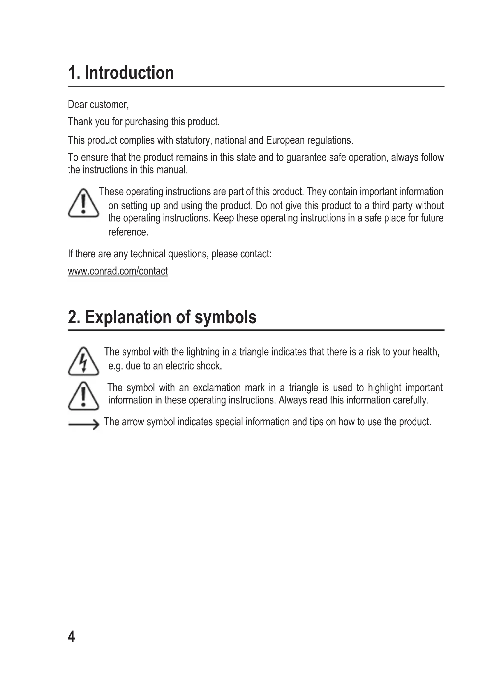 The symbol with the lightning in a triangle indicates that there is a risk to your health, e.g. due to an electric shock. The symbol with an exclamation mark in a triangle is used to highlight important information in these operating instructions. Always read this information carefully. The arrow symbol indicates special information and tips on how to use the product.