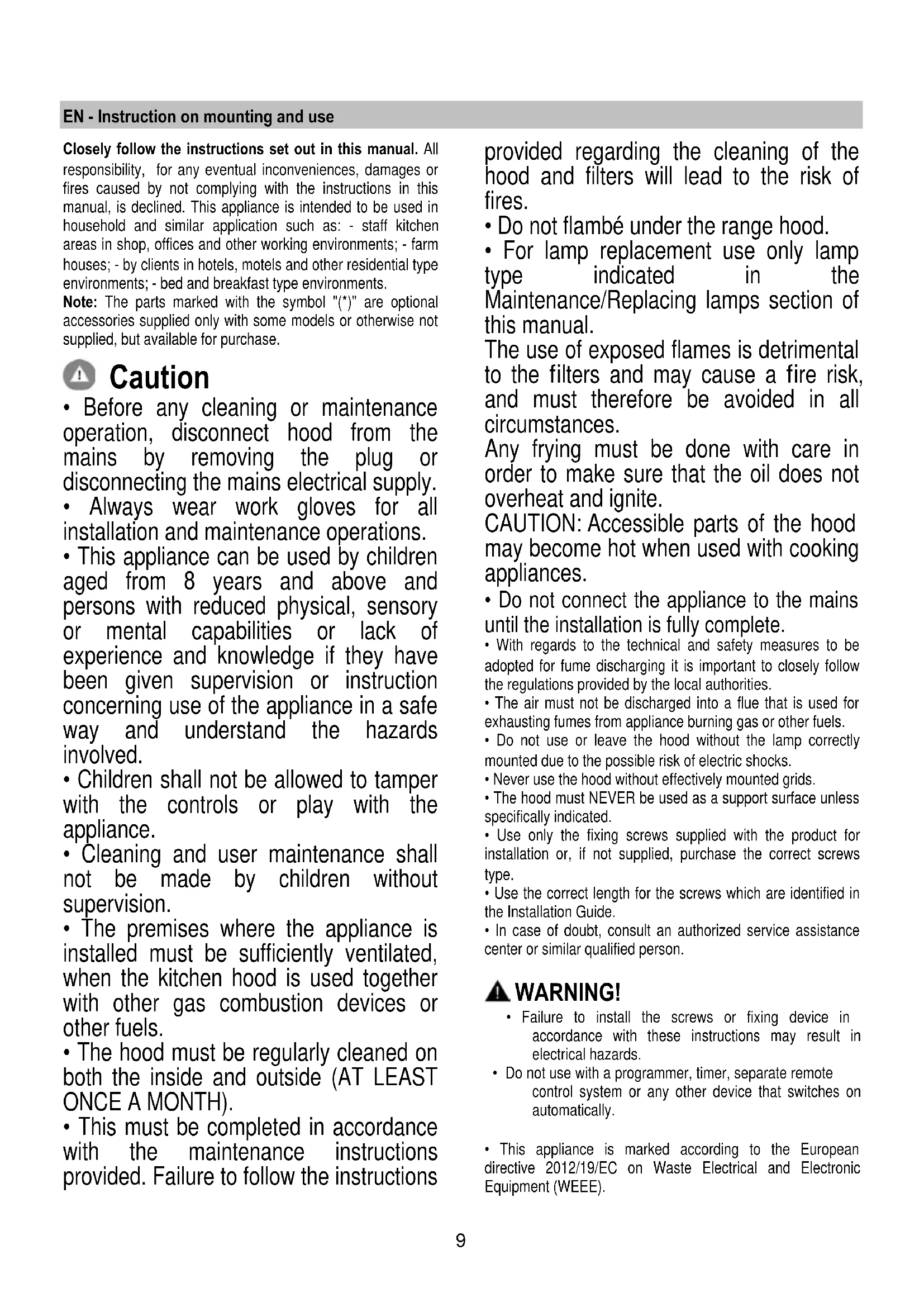 - This must be completed in accordance with the maintenance instructions provided. Failure to follow the instructions provided regarding the cleaning of the hood and filters will lead to the risk of fires.