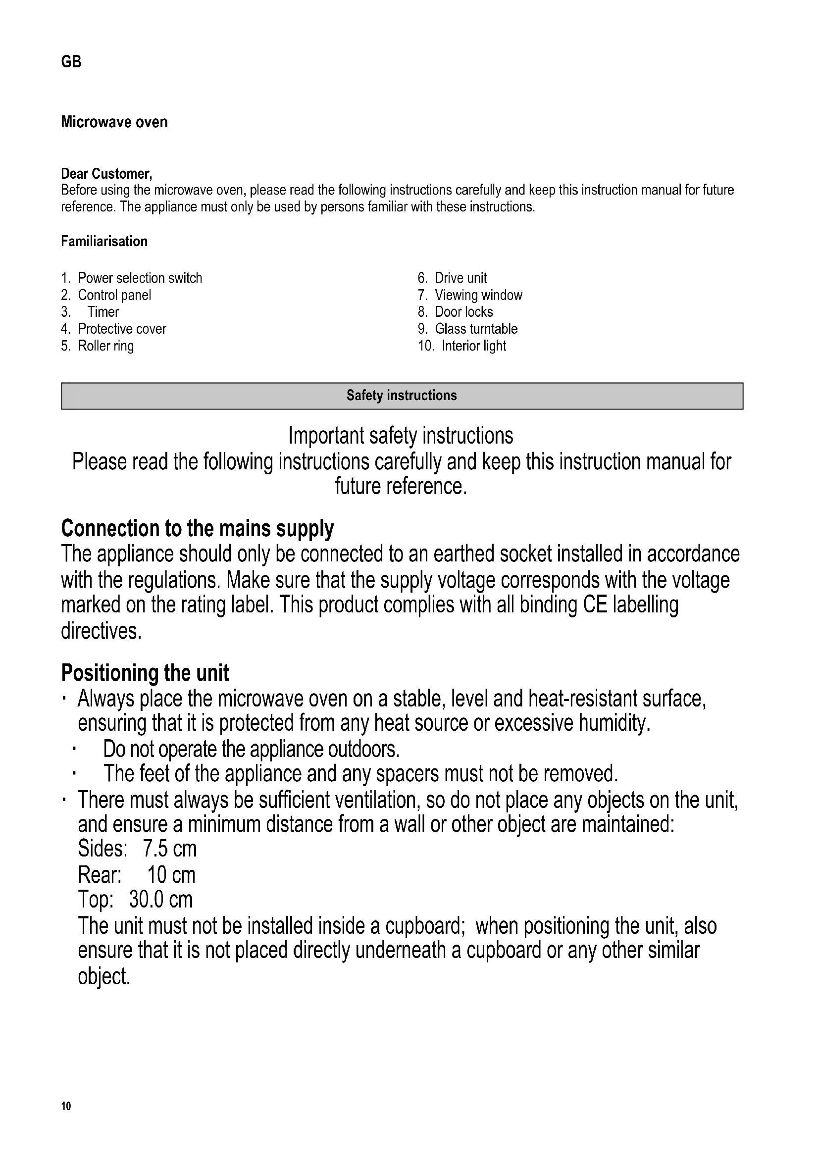 Safety instructions Important safety instructions Please read the following instructions carefully and keep this instruction manual for future reference. Connection to the mains supply The appliance should only be connected to an earthed socket installed in accordance with the regulations. Make sure that the supply voltage corresponds with the voltage marked on the rating label. This product complies with all binding CE labelling directives. Positioning the unit ∙ Always place the microwave oven on a stable, level and heat-resistant surface, ensuring that it is protected from any heat source or excessive humidity. ∙ Do not operate the appliance outdoors. ∙ The feet of the appliance and any spacers must not be removed. ∙ There must always be sufcient ventilation, so do not place any objects on the unit, and ensure a minimum distance from a wall or other object are maintained: Sides: 7.5 cm Rear: 10 cm Top: 30.0 cm The unit must not be installed inside a cupboard; when positioning the unit, also ensure that it is not placed directly underneath a cupboard or any other similar object.11 142 x 208 mm Important notes ∙ Caution: certain types of food may tend to catch re. Do not leave the appliance unattended while in use. ∙ This microwave oven is intended for the defrosting, heating and cooking of food only. Caution: any attempt to dry food or clothing, to heat up warming pads, house slippers, sponges, wet cleaning cloths etc. may cause injuries, combustion or re. ∙ No responsibility will be accepted if damage results from improper use, or if these instructions are not complied with. ∙ Only dishes suitable for microwave use may be used. Metal containers are not permitted for heating food and drinks in microwave mode. For detailed information, please refer to section ‘Always use suitable kitchen utensils’. ∙ The appliance is not intended to be operated by means of an external timer or separate remote-control system. ∙ This appliance may be used by children (at least 8 years of age) and by persons with reduced physical, sensory or mental capabilities, or lacking experience and knowledge, provided they have been given supervision or instruction concerning the use of the appliance and fully understand all dangers and safety precautions involved. ∙ Children must not be permitted to play with the appliance. ∙ Children must not be permitted to carry out any cleaning or maintenance work on the appliance unless they are supervised. ∙ The appliance and its power cord must be kept well away from children under 8 at all times. ∙ To avoid any risk of electric shock, do not clean the appliance with liquids or immerse it in a liquid. ∙ The appliance must not be cleaned using a steam cleaner. ∙ Always switch the appliance off and remove the plug from the wall socket: - before cleaning, - in case of any malfunction, - after each use. ∙ When removing the plug from the wall socket, never pull on the power cord; always grip the plug itself. Never touch the mains plug with wet hands.