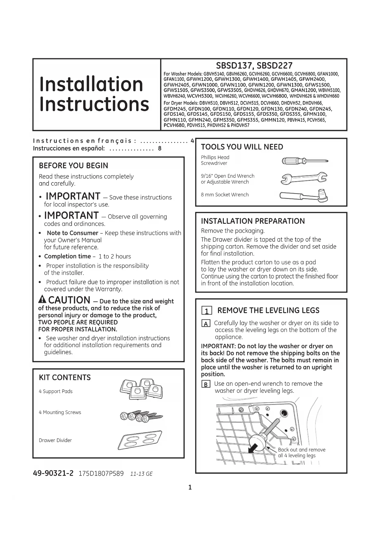 of these products, and to reduce the risk of personal injury or damage to the product, TWO PEOPLE ARE REQUIRED FOR PROPER INSTALLATION.• See washer and dryer installation instructions for additional installation requirements and guidelines. 49-90321-2 175D1807P589 11-13 GE2 Installation Instructions