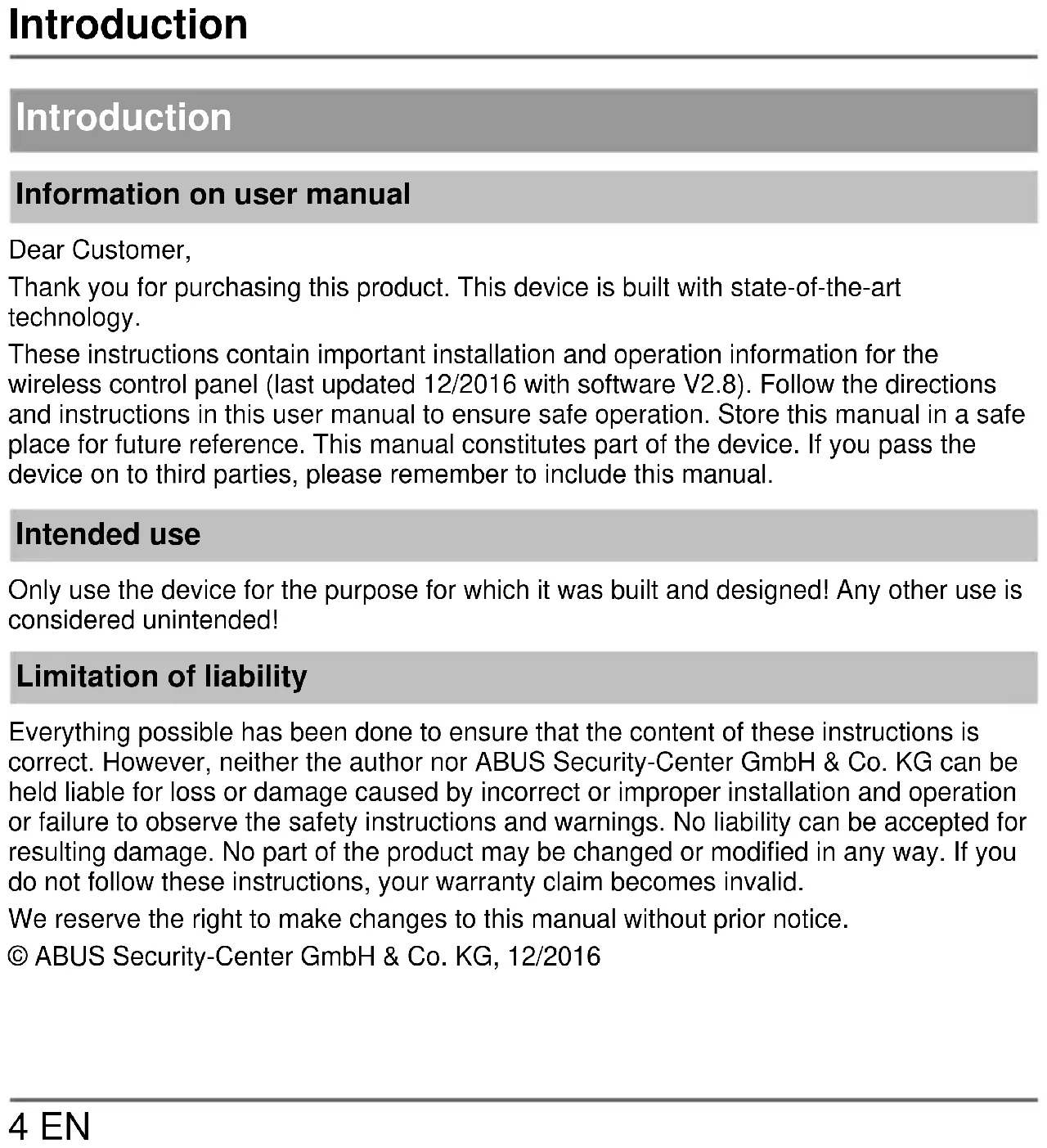 4 EN Introduction Information on user manual Dear Customer, Thank you for purchasing this product. This device is built with state-of-the-art technology. These instructions contain important installation and operation information for the wireless control panel (last updated 12/2016 with software V2.8). Follow the directions and instructions in this user manual to ensure safe operation. Store this manual in a safe place for future reference. This manual constitutes part of the device. If you pass the device on to third parties, please remember to include this manual. Intended use Only use the device for the purpose for which it was built and designed! Any other use is considered unintended! Limitation of liability Everything possible has been done to ensure that the content of these instructions is correct. However, neither the author nor ABUS Security-Center GmbH & Co. KG can be held liable for loss or damage caused by incorrect or improper installation and operation or failure to observe the safety instructions and warnings. No liability can be accepted for resulting damage. No part of the product may be changed or modified in any way. If you do not follow these instructions, your warranty claim becomes invalid. We reserve the right to make changes to this manual without prior notice. © ABUS Security-Center GmbH & Co. KG, 12/2016Safety information