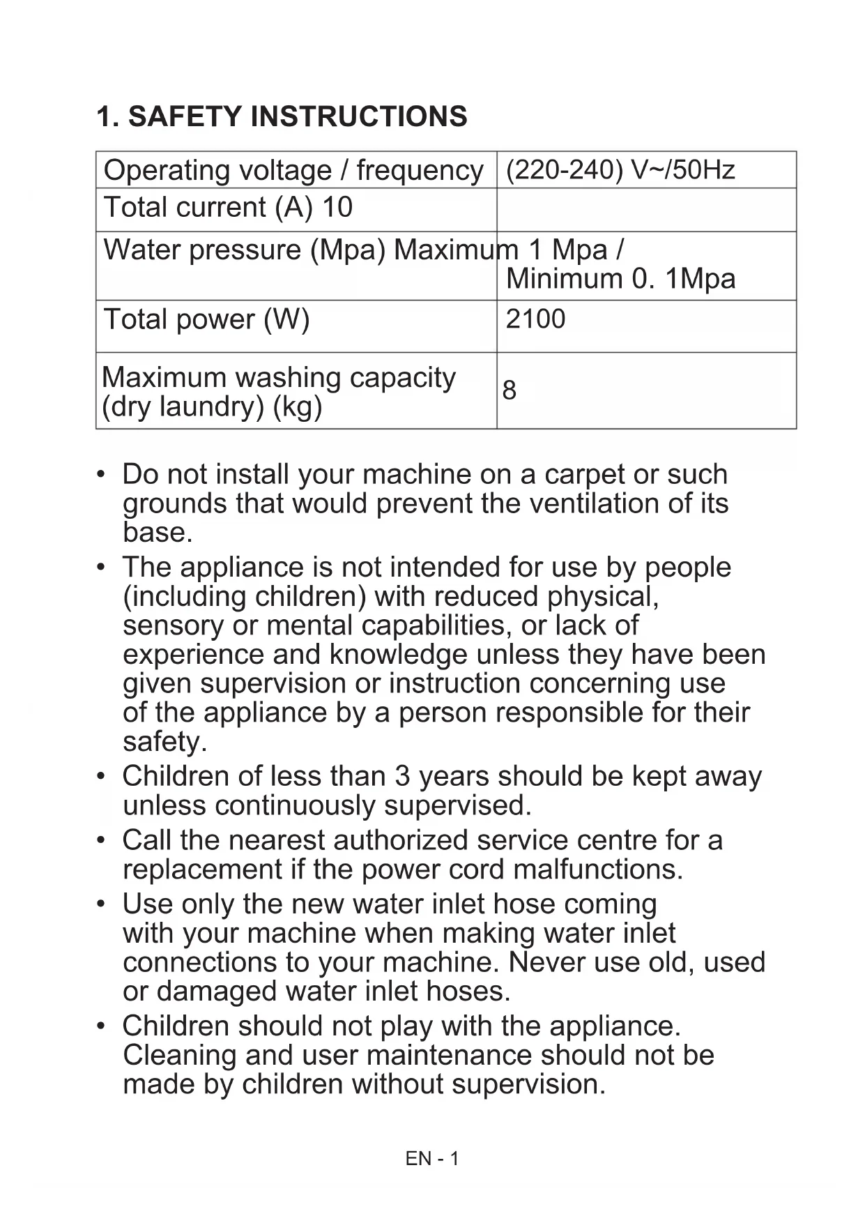 - Do not exceed the maximum load for the washing programme you have chosen. EN - 3Never force the door open when your Washing Machine is running.