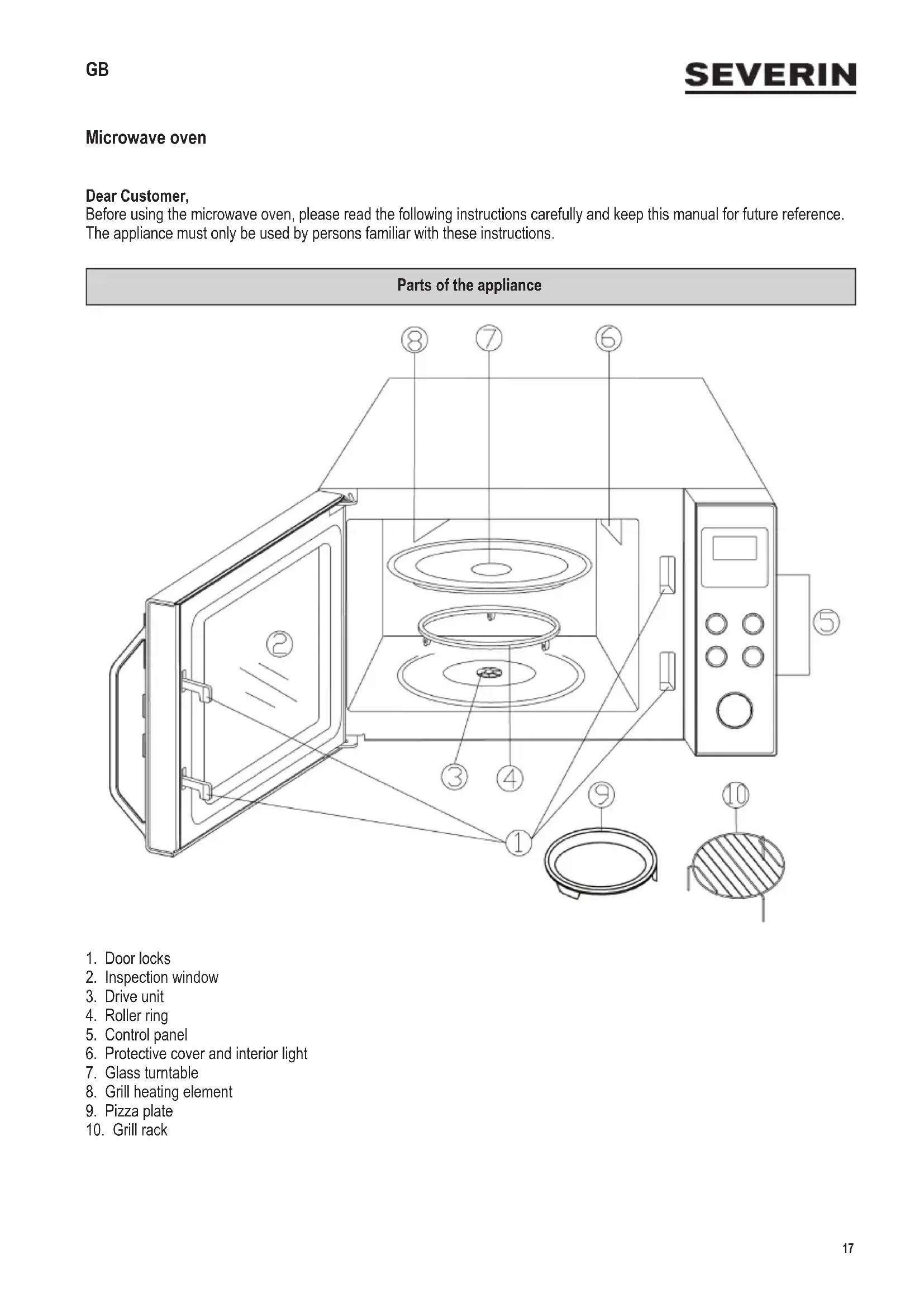 Caution: The exterior surfaces of the appliance may become hot during operation. There is also a danger of steam being emitted through the ventilation slots, with a consequent risk of scalding. ∙ Do not allow the appliance or its power cord to touch hot surfaces or come into contact with any heat sources. Do not let the power cord hang free, and keep it away from any hot parts. ∙ If the unit is not kept properly clean, deterioration in the quality of its surfaces may be caused, with possible subsequent shortening of its life-cycle, as well as potential risk to the user’s safety. Any food residue should therefore be removed right away. For detailed information on cleaning the appliance, please refer to the section Cleaning.22 142 x 208 mm ∙ This appliance is intended for domestic or similar applications, such as the - staff kitchens in shops, ofces and other similar working environments, - agricultural working environments, - by customers in hotels, motels etc. and similar accommodation, - in bed-and breakfast type environments. ∙ Caution: Any maintenance or repair work requiring the removal of any microwave radiation protection cover represents a serious hazard to unqualied persons. This includes the replacement of the special power cord or an interior light bulb. The unit must not be opened, except by qualied personnel. If repairs are needed, please send the appliance to one of our customer service departments. The address can be found in the appendix to this manual. ∙ When heating liquids in your microwave oven, the liquid may heat up beyond boiling-point without visible evidence of bubbling. It is therefore important to exercise extreme caution when handling any containers, e.g. when removing them from the oven. The risk of such over-boiling may be reduced by placing a heat-resistant glass rod in the container during the heating process. ∙ Eggs in their shells or whole hard-boiled eggs must not be heated up in a microwave oven, since they may explode even after the microwave heating process has nished. ∙ Caution: It is also highly dangerous to heat up liquids or any kind of solid food items in closed containers in the unit, since there is a real danger of explosion. ∙ The contents of baby bottles or glass containers with baby food must be thoroughly stirred or shaken to ensure that the temperature is evenly distributed. Caution: To avoid painful and dangerous scalding, always check the temperature before feeding a child. ∙ When heating or cooking food contained or wrapped in combustible materials such as plastic or paper, there is a danger of those materials igniting. It is also possible that food will dry out or even ignite if the selected cooking time is excessive. Fat or oil are also inammable substances. It is therefore important to supervise the appliance during operation. Highly volatile or inammable liquids such as concentrated alcohol must of course not be heated up. ∙ Should any smoke be noticed during operation, keep the door closed to inhibit or smother any ames. Switch the unit off immediately and remove the plug from the wall socket. ∙ To prevent danger of burns, a suitable oven-cloth must always be used when removing food items from the oven, since the utensils and cooking containers heat up not only during use of the grill or hot-air functions, but also during microwave operation.23 142 x 208 mm ∙ Special food thermometers (as used in conventional baking ovens) are not suitable for use with microwave ovens. Beforeusingforthersttime ∙ After unpacking and every time before connecting the unit to the power supply, check the unit and its power cord carefully for any signs of damage. ∙ Caution: Ensure that the door, including the inspection window, door seals and locks, are not damaged or bent and that it closes rmly against the support. This is important to ensure that no microwave energy is allowed to escape during operation. For the same reason, the entire casing as well as the inside of the oven must be carefully checked. Should the unit show any signs of damage, it must not be used under any circumstances until it has been repaired by a qualied technician. ∙ Remove any exterior and interior packaging materials, and any stickers found. All these materials are suitable for recycling. ∙ Do not remove the protective lm covering the inside of the door, nor the turntable/ drive unit or the grey-brown protective cover (6) next to the light on the right of the interior. ∙ Caution: Keep any packaging materials well away from children – such materials are a potential source of danger, e.g. of suffocation. ∙ Before the appliance is used for the rst time, or after extended periods of non-use, it should be thoroughly cleaned as described in the section Cleaning. ∙ Insert the roller ring/drive unit and the glass turntable into the unit. ∙ Do not operate the appliance without the roller ring/drive unit and glass turntable properly tted. ∙ Before the microwave appliance is used for the rst time, let it heat up on the grill setting (without the microwave function activated) for approximately 10 minutes. This will remove the smell typically encountered when rst switching on a grill. A little smoke may be emitted; this is quite normal, but ensure there is sufcient ventilation. ∙ This appliance is a group 2 class B ISM device. Group 2 contains all ISM devices (industrial, scientic, medical) generating radio frequency energy and/or using radio frequency energy in the form of electro-magnetic radiation to process materials; it also comprises spark erosion devices. Class B species devices designed for domestic use, or any similar devices integrated in the general power grid supplying domestic units. Note: Do not switch the unit on unless the food to be heated or cooked has been placed inside the oven. Operating the appliance empty could result in damage to the unit. The microwave function (Group II in compliance with EN 55011) Electromagnetic en