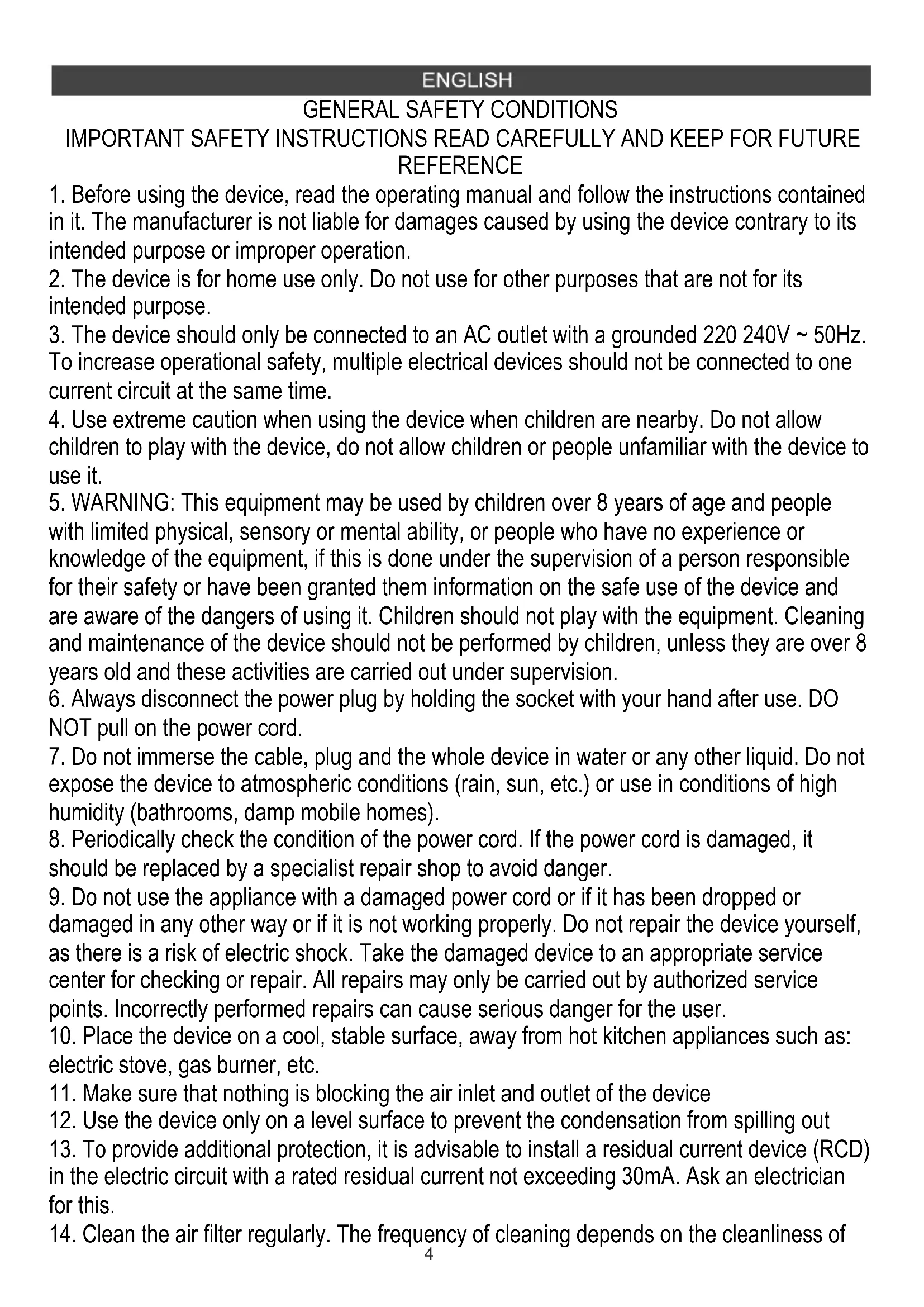 12. Use the device only on a level surface to prevent the condensation from spilling out