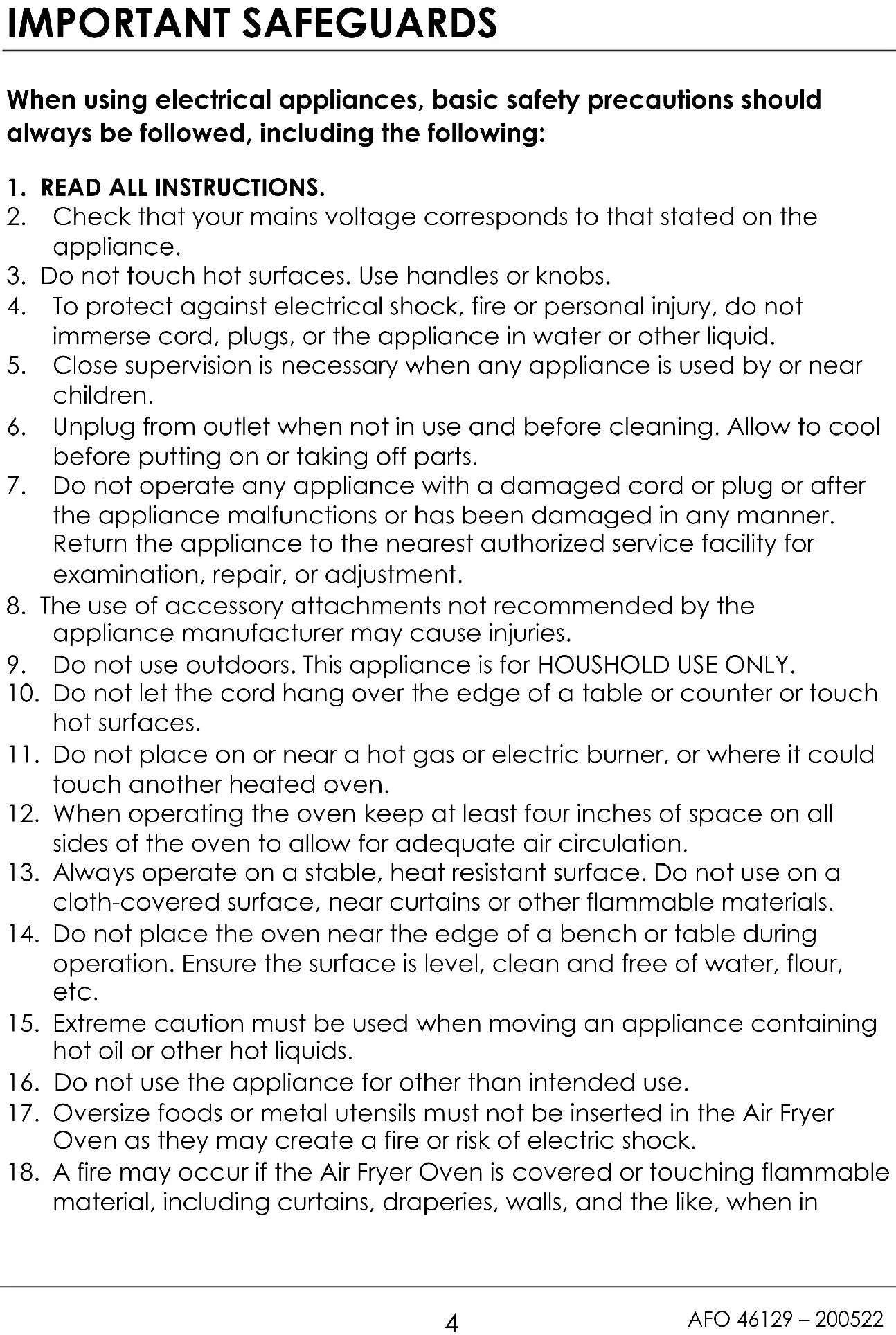 AFO 46129 – 200522 IMPORTANT SAFEGUARDS When using electrical appliances, basic safety precautions should always be followed, including the following:
