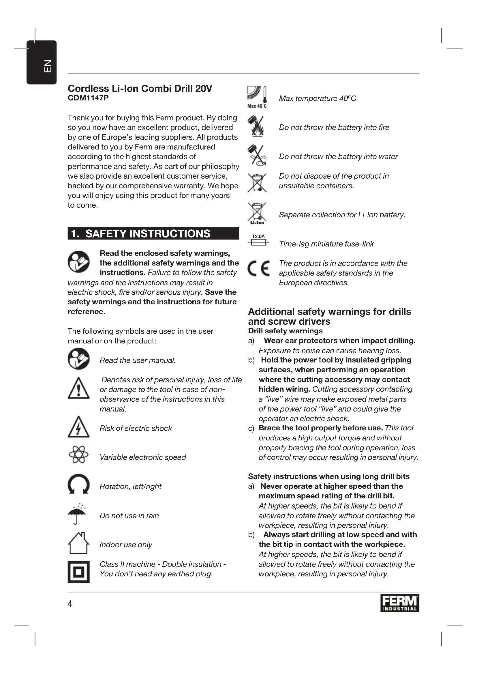Cordless Li-Ion Combi Drill 20V CDM1147P Thank you for buying this Ferm product. By doing so you now have an excellent product, delivered by one of Europe’s leading suppliers. All products delivered to you by Ferm are manufactured according to the highest standards of performance and safety. As part of our philosophy we also provide an excellent customer service, backed by our comprehensive warranty. We hope you will enjoy using this product for many years to come.
