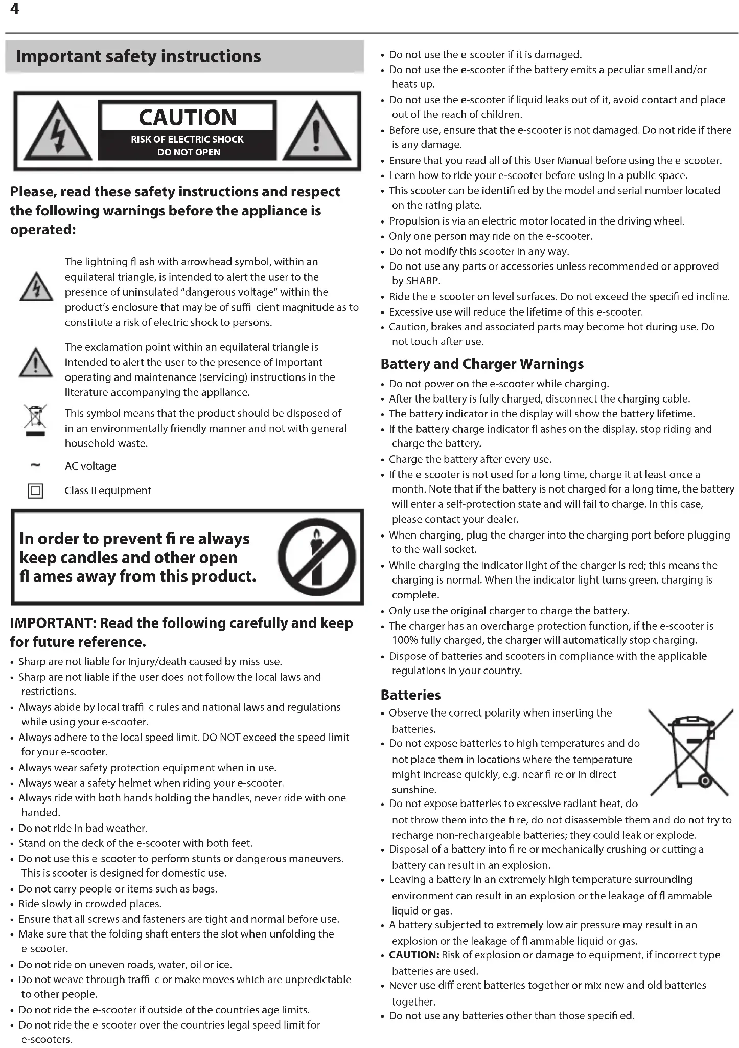 - Sharp are not liable for Injury/death caused by miss-use.• Sharp are not liable if the user does not follow the local laws and restrictions.• Always abide by local tra c rules and national laws and regulations while using your e-scooter.• Always adhere to the local speed limit. DO NOT exceed the speed limit for your e-scooter.• Always wear safety protection equipment when in use.• Always wear a safety helmet when riding your e-scooter.• Always ride with both hands holding the handles, never ride with one handed.• Do not ride in bad weather.• Stand on the deck of the e-scooter with both feet.• Do not use this e-scooter to perform stunts or dangerous maneuvers. This is scooter is designed for domestic use.• Do not carry people or items such as bags.• Ride slowly in crowded places.• Ensure that all screws and fasteners are tight and normal before use.• Make sure that the folding shaft enters the slot when unfolding the e-scooter.• Do not ride on uneven roads, water, oil or ice.• Do not weave through tra c or make moves which are unpredictable to other people.• Do not ride the e-scooter if outside of the countries age limits.• Do not ride the e-scooter over the countries legal speed limit for e-scooters.• Do not use the e-scooter if it is damaged.• Do not use the e-scooter if the battery emits a peculiar smell and/or heats up.• Do not use the e-scooter if liquid leaks out of it, avoid contact and place out of the reach of children.• Before use, ensure that the e-scooter is not damaged. Do not ride if there is any damage.• Ensure that you read all of this User Manual before using the e-scooter.• Learn how to ride your e-scooter before using in a public space.• This scooter can be identi ed by the model and serial number located on the rating plate.• Propulsion is via an electric motor located in the driving wheel.• Only one person may ride on the e-scooter.• Do not modify this scooter in any way.• Do not use any parts or accessories unless recommended or approved by SHARP.• Ride the e-scooter on level surfaces. Do not exceed the speci ed incline.• Excessive use will reduce the lifetime of this e-scooter.• Caution, brakes and associated parts may become hot during use. Do not touch after use. Battery and Charger Warnings