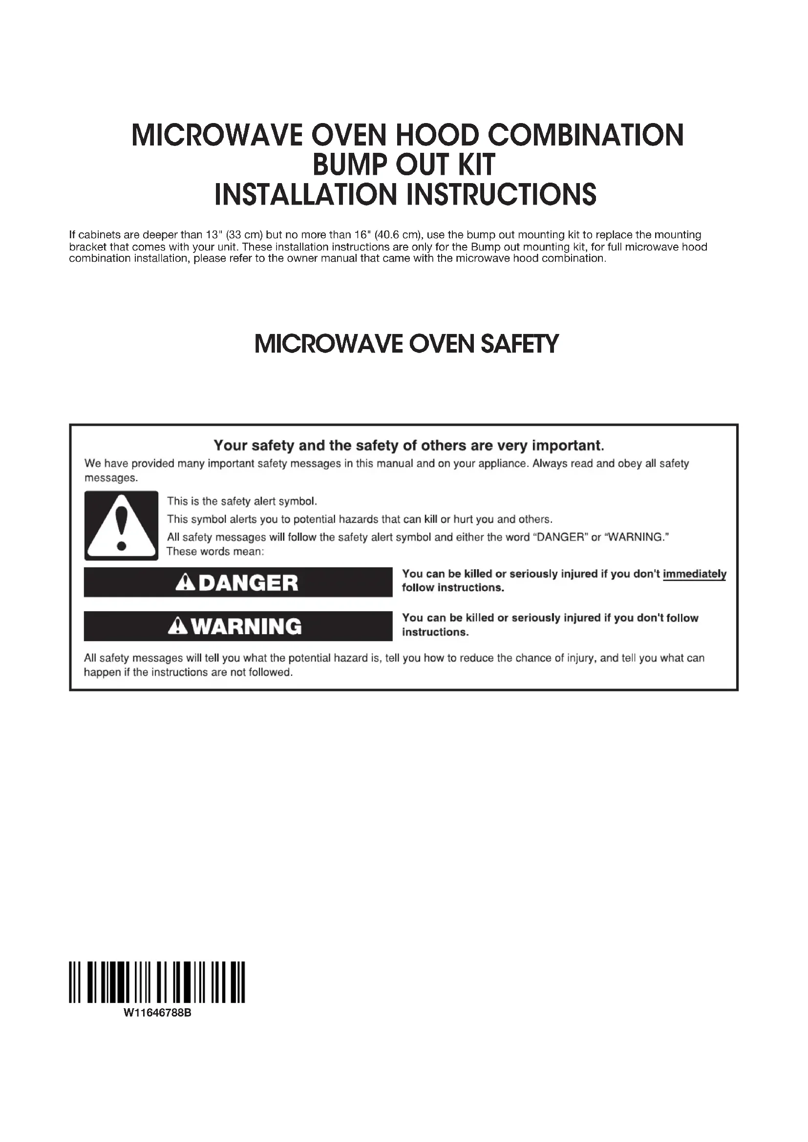 INSTALLATION INSTRUCTIONS If cabinets are deeper than 13" (33 cm) but no more than 16" (40.6 cm), use the bump out mounting kit to replace the mounting bracket that comes with your unit. These installation instructions are only for the Bump out mounting kit, for full microwave hood combination installation, please refer to the owner manual that came with the microwave hood combination.