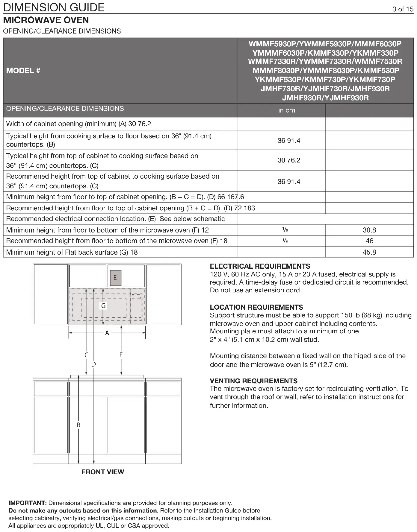 DDIMENSION GUIDE 4 of 15IMPORTANT: Dimensional specications are provided for planning purposes only.Do not make any cutouts based on this information. Refer to the Installation Guide before selecting cabinetry, verifying electrical/gas connections, making cutouts or beginning installation.All appliances are appropriately UL, CUL or CSA approved. MICROWAVE OVEN