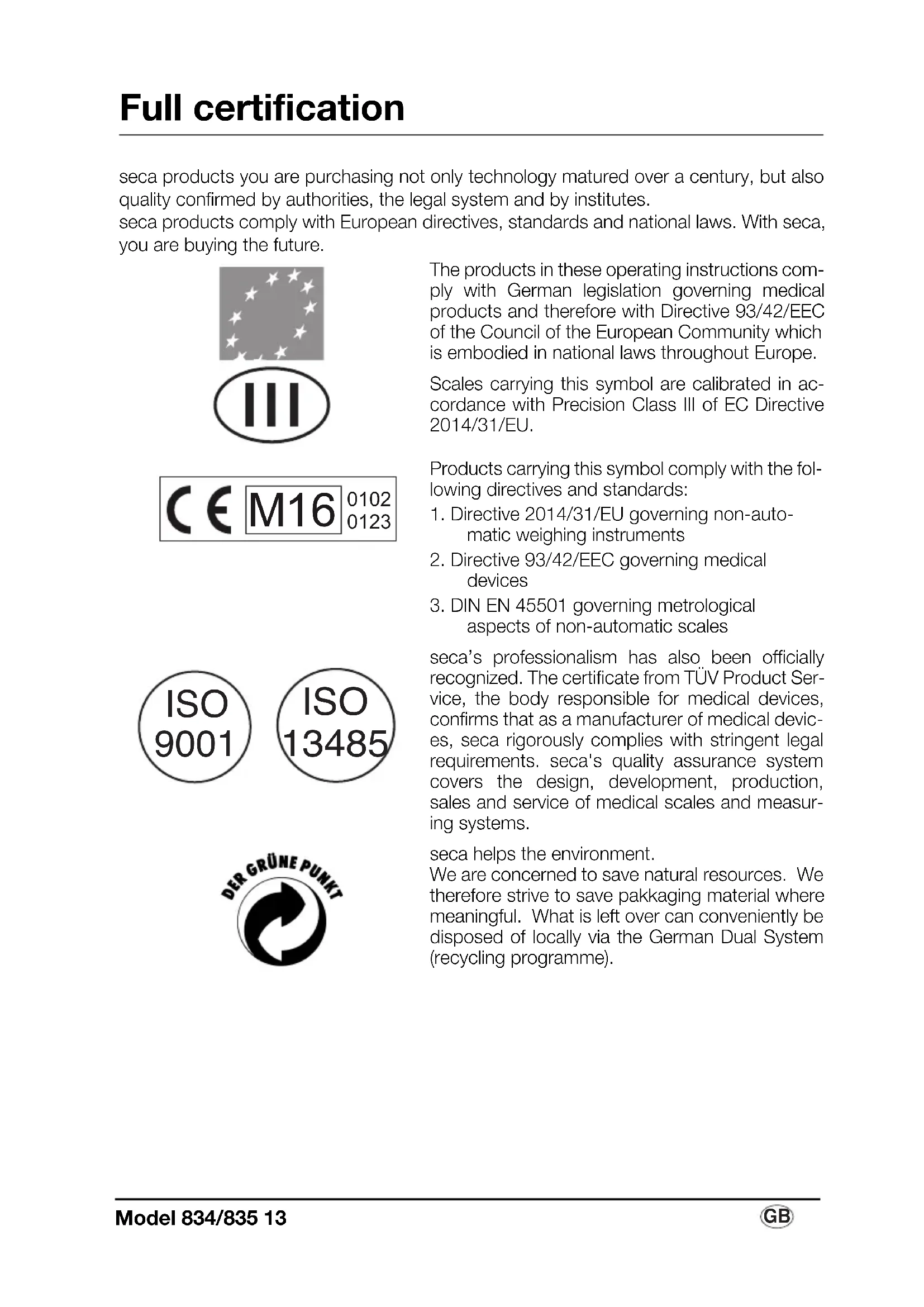 Full certification seca products you are purchasing not only technology matured over a century, but also quality confirmed by authorities, the legal system and by institutes. seca products comply with European directives, standards and national laws. With seca, you are buying the future.The products in these operating instructions com-ply with German legislation governing medical products and therefore with Directive 93/42/EEC of the Council of the European Community which is embodied in national laws throughout Europe.Scales carrying this symbol are calibrated in ac-cordance with Precision Class III of EC Directive 2014/31/EU. Products carrying this symbol comply with the fol-lowing directives and standards: 1. Directive 2014/31/EU governing non-auto-matic weighing instruments2. Directive 93/42/EEC governing medical devices3. DIN EN 45501 governing metrological aspects of non-automatic scalesseca’s professionalism has also been officially recognized. The certificate from TÜV Product Ser-vice, the body responsible for medical devices, confirms that as a manufacturer of medical devic-es, seca rigorously complies with stringent legal requirements. seca's quality assurance system covers the design, development, production, sales and service of medical scales and measur-ing systems.seca helps the environment. We are concerned to save natural resources. We therefore strive to save pakkaging material where meaningful. What is left over can conveniently be disposed of locally via the German Dual System (recycling programme).