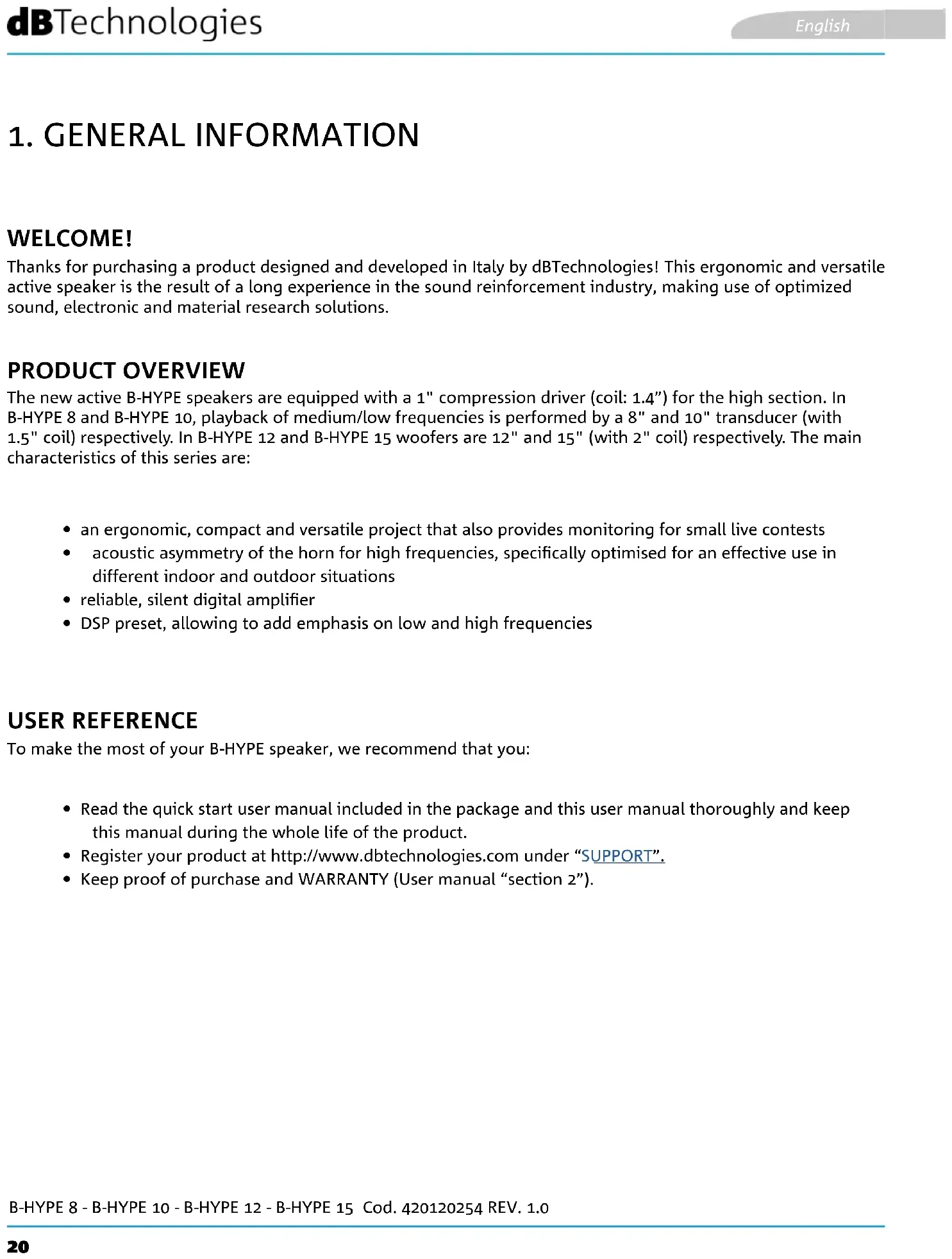 WELCOME! PRODUCT OVERVIEW USER REFERENCE Thanks for purchasing a product designed and developed in Italy by dBTechnologies! This ergonomic and versatile active speaker is the result of a long experience in the sound reinforcement industry, making use of optimized sound, electronic and material research solutions. The new active B-HYPE speakers are equipped with a 1" compression driver (coil: 1.4”) for the high section. In B-HYPE 8 and B-HYPE 10, playback of medium/low frequencies is performed by a 8" and 10" transducer (with 1.5" coil) respectively. In B-HYPE 12 and B-HYPE 15 woofers are 12" and 15" (with 2" coil) respectively. The main characteristics of this series are: To make the most of your B-HYPE speaker, we recommend that you: