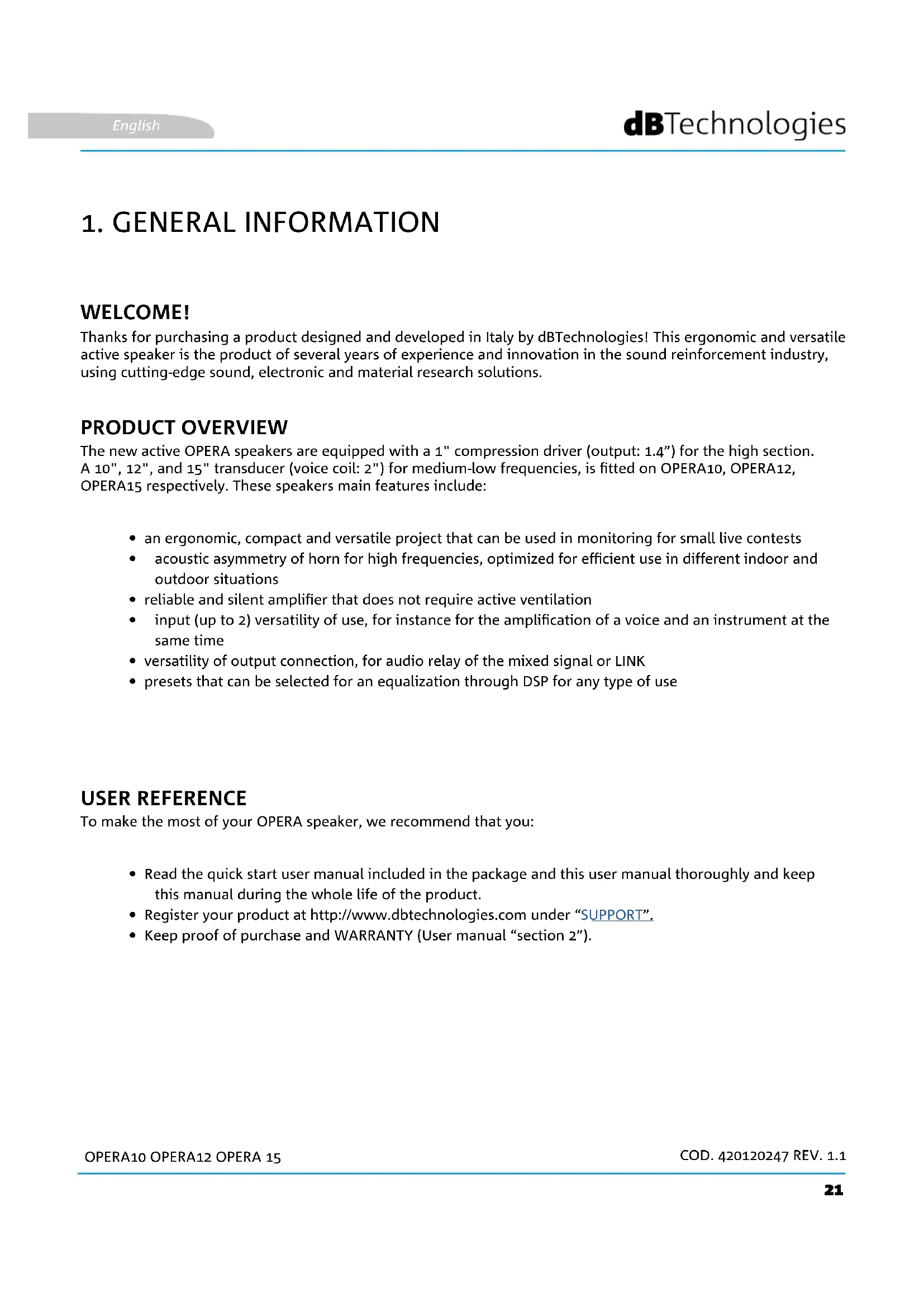 - According to the standards EN 55103 this equipment is designed and suitable to operate in E3 (or lower E2, E1) Electromagnetic environments. Make sure that the loudspeaker is securely installed in a stable position to avoid any injuries or damages to persons or properties. For safety reasons di not place one loudspeaker on top of another without proper fastening systems. Before hanging the loudspeaker check all the components for damages, deformations, missing or damaged parts that may compromise safety during installation. If you use the loudspeakers outdoor avoid spots exposed to bad weather conditions. Contact dBTechnologies for accessories to be used with the speakers. dBTechnologies will not accept any responsibility for damages caused by inappropiate accessories or additional devices. WARNING This equipment has been tested and found to comply with the limits for a Class B digital device, pursuant to part 15 of the FCC Rules. These limits are designed to provide reasonable protection against harmful interference in a residential installation. This equipment generates, uses and can radiate radio frequency energy and, if not installed and used in accordance with the instructions, may cause harmful interference to radio communications. However, there is no guarantee that interference will not occur in a particular installation. If this equipment does cause harmful interference to radio or television reception, which can be determined by turning the equipment off and on, the user is encouraged to try to correct the interference by one or more of the following measures: —Reorient or relocate the receiving antenna. —Increase the separation between the equipment and receiver. —Connect the equipment into an outlet on a circuit different from that to which the receiver is connected. —Consult the dealer or an experienced radio/TV technician for help. Changes or modications not expressly approved by the party responsible for compliance could void the user’s authority to operate the equipment.3 OPERA10 - OPERA12 - OPERA 15 Cod. 420120247 REV. 1.1 ITALIANO ENGLISH DEUTSCH FRANÇAIS ESPAÑOL4 OPERA10 - OPERA12 - OPERA 15 Cod. 420120247 REV. 1.1 INDICE Italiano INDICE 1. INFORMAZIONI GENERALI p. 5