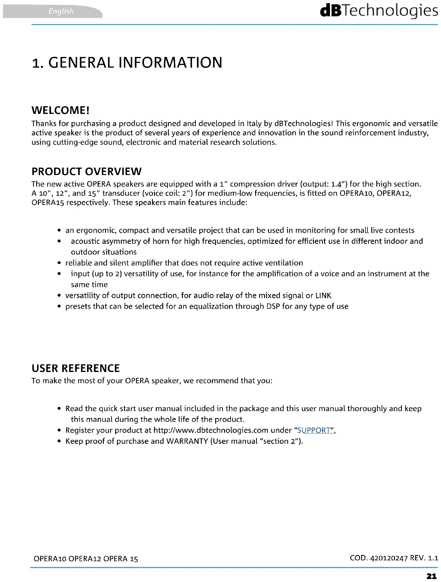 WELCOME! PRODUCT OVERVIEW USER REFERENCE Thanks for purchasing a product designed and developed in Italy by dBTechnologies! This ergonomic and versatile active speaker is the product of several years of experience and innovation in the sound reinforcement industry, using cutting-edge sound, electronic and material research solutions. The new active OPERA speakers are equipped with a 1" compression driver (output: 1.4”) for the high section. A 10", 12", and 15" transducer (voice coil: 2") for medium-low frequencies, is tted on OPERA10, OPERA12, OPERA15 respectively. These speakers main features include: To make the most of your OPERA speaker, we recommend that you: