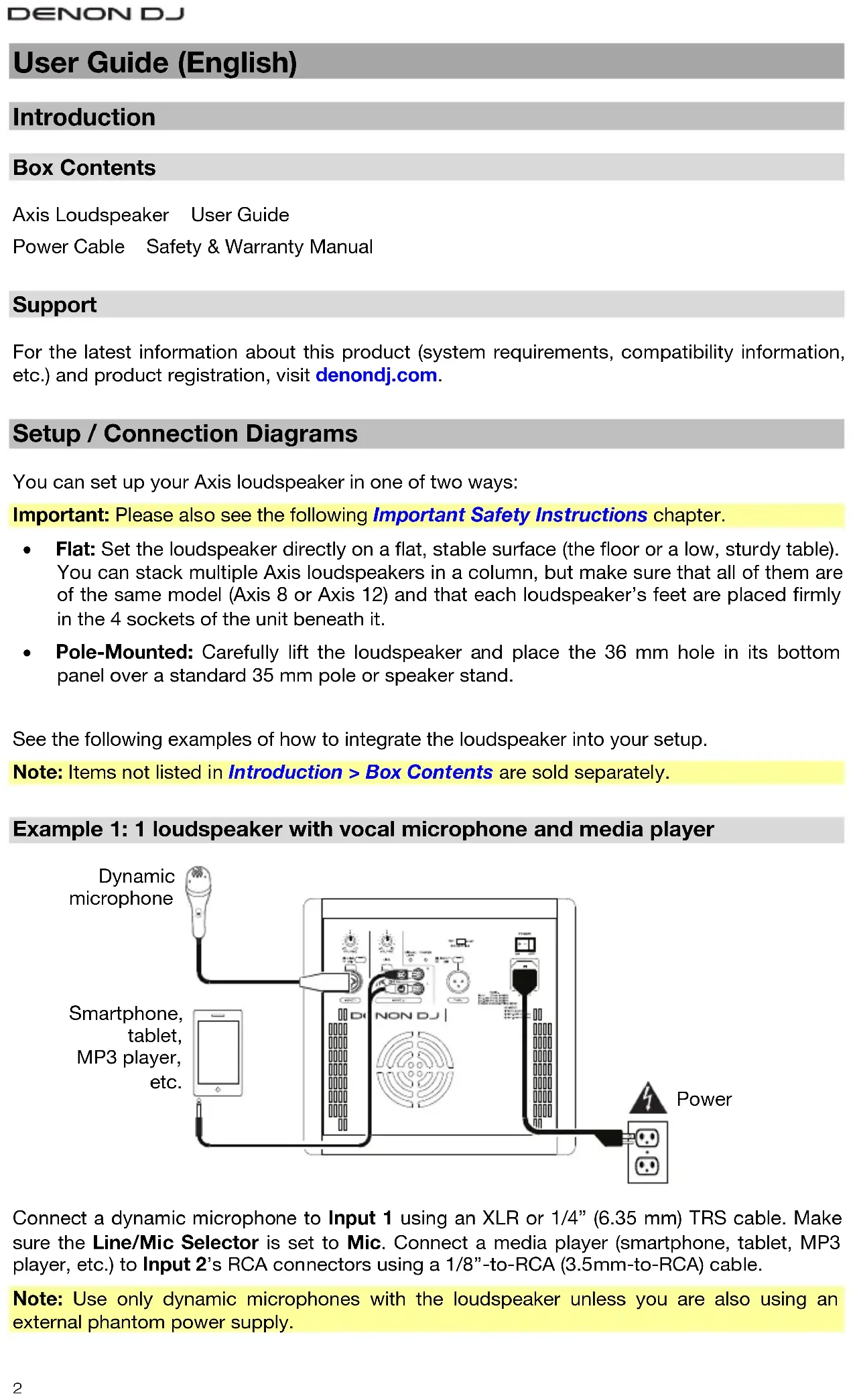 User Guide (English) Introduction Box Contents Axis Loudspeaker User Guide Power Cable Safety & Warranty Manual Support For the latest information about this product (system requirements, compatibility information, etc.) and product registration, visit denondj.com. Setup / Connection Diagrams You can set up your Axis loudspeaker in one of two ways: Important: Please also see the following Important Safety Instructions chapter.