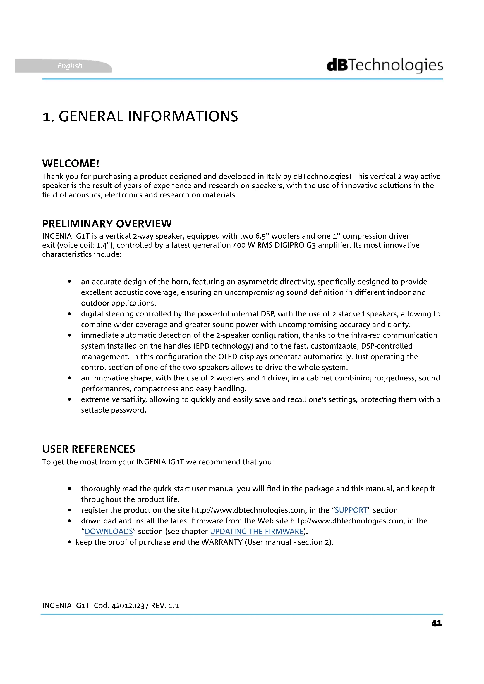 WELCOME! PRELIMINARY OVERVIEW USER REFERENCES Thank you for purchasing a product designed and developed in Italy by dBTechnologies! This vertical 2-way active speaker is the result of years of experience and research on speakers, with the use of innovative solutions in the eld of acoustics, electronics and research on materials. INGENIA IG1T is a vertical 2-way speaker, equipped with two 6.5” woofers and one 1” compression driver exit (voice coil: 1.4”), controlled by a latest generation 400 W RMS DIGIPRO G3 amplier. Its most innovative characteristics include: To get the most from your INGENIA IG1T we recommend that you: