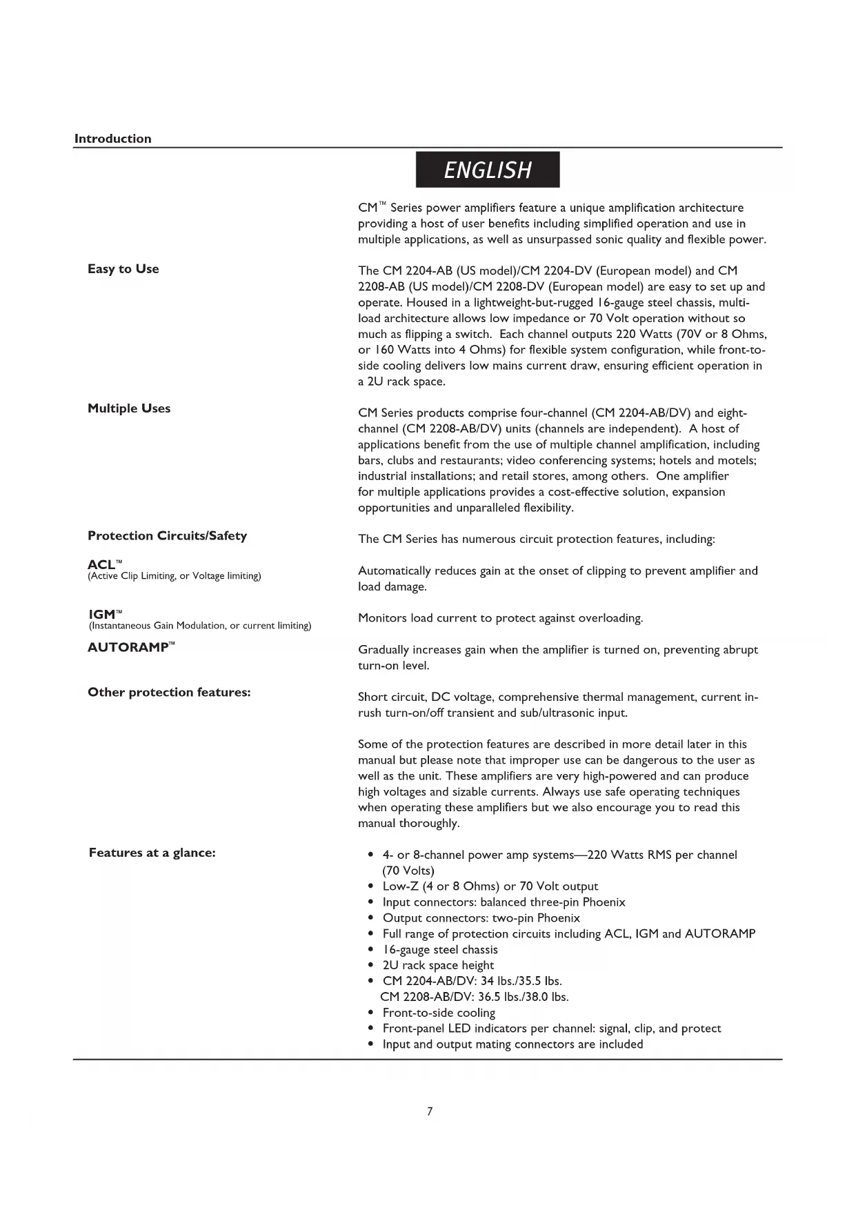 Series power amplifiers feature a unique amplification architecture providing a host of user benefits including simplified operation and use in multiple applications, as well as unsurpassed sonic quality and flexible power. The CM 2204-AB (US model)/CM 2204-DV (European model) and CM 2208-AB (US model)/CM 2208-DV (European model) are easy to set up and operate. Housed in a lightweight-but-rugged 16-gauge steel chassis, multi- load architecture allows low impedance or 70 Volt operation without so much as flipping a switch. Each channel outputs 220 Watts (70V or 8 Ohms, or 160 Watts into 4 Ohms) for flexible system configuration, while front-to- side cooling delivers low mains current draw, ensuring efficient operation in a 2U rack space. CM Series products comprise four-channel (CM 2204-AB/DV) and eight- channel (CM 2208-AB/DV) units (channels are independent). A host of applications benefit from the use of multiple channel amplification, including bars, clubs and restaurants; video conferencing systems; hotels and motels; industrial installations; and retail stores, among others. One amplifier for multiple applications provides a cost-effective solution, expansion opportunities and unparalleled flexibility. The CM Series has numerous circuit protection features, including: Automatically reduces gain at the onset of clipping to prevent amplifier and load damage. Monitors load current to protect against overloading. Gradually increases gain when the amplifier is turned on, preventing abrupt turn-on level. Short circuit, DC voltage, comprehensive thermal management, current in- rush turn-on/off transient and sub/ultrasonic input. Some of the protection features are described in more detail later in this manual but please note that improper use can be dangerous to the user as well as the unit. These amplifiers are very high-powered and can produce high voltages and sizable currents. Always use safe operating techniques when operating these amplifiers but we also encourage you to read this manual thoroughly.