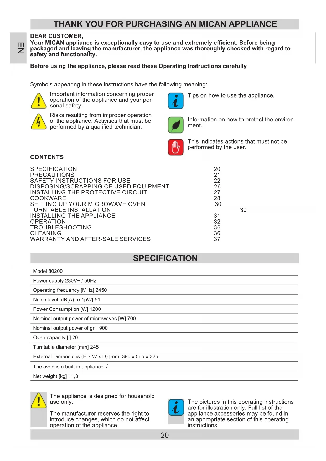 The pictures in this operating instructions are for illustration only. Full list of the appliance accessories may be found in an appropriate section of this operating instructions. Model 80200Power supply 230V~ / 50HzOperating frequency [MHz] 2450Noise level [dB(A) re 1pW] 51Power Consumption [W] 1200Nominal output power of microwaves [W] 700Nominal output power of grill 900Oven capacity [l] 20Turntable diameter [mm] 245External Dimensions (H x W x D) [mm] 390 x 565 x 325The oven is a built-in appliance √Net weight [kg] 11,3 SPECIFICATION CONTENTS SPECIFICATION 20 PRECAUTIONS 21