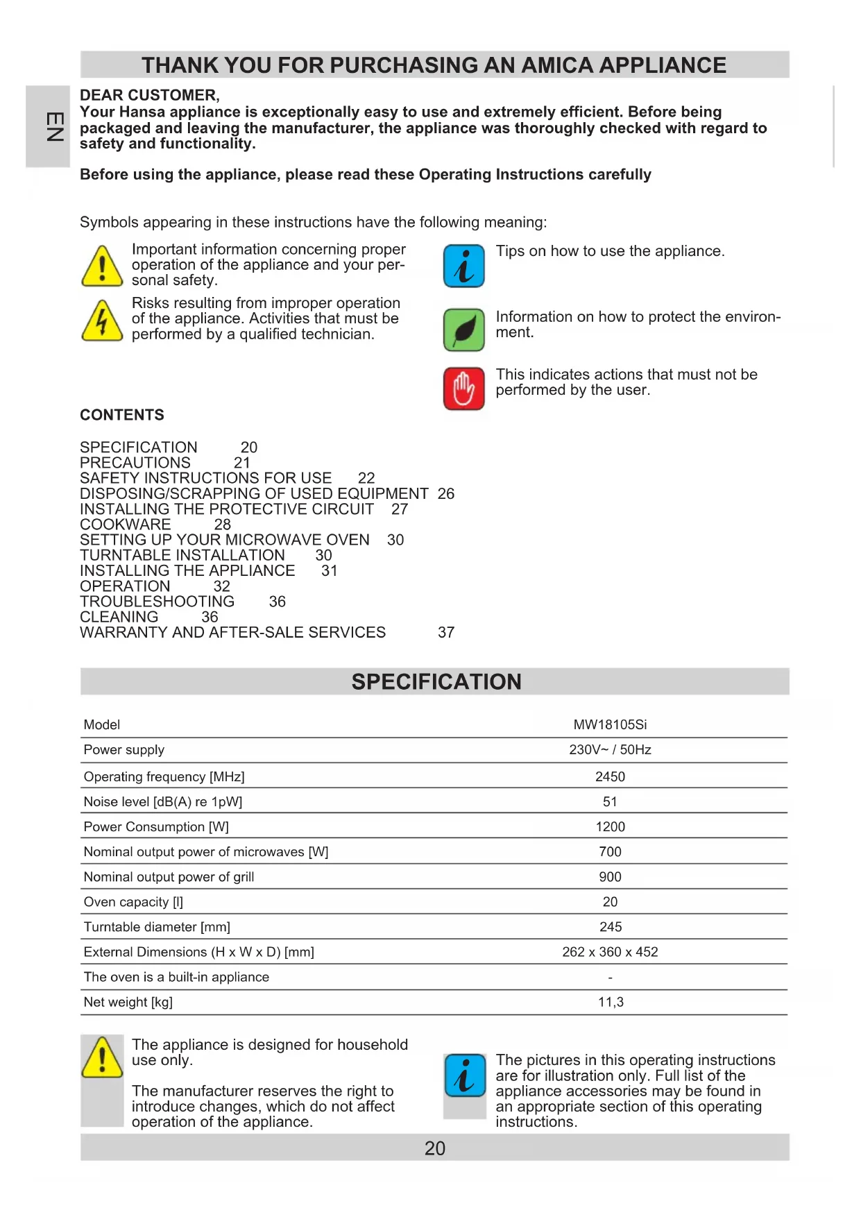 The pictures in this operating instructions are for illustration only. Full list of the appliance accessories may be found in an appropriate section of this operating instructions. SPECIFICATION CONTENTS SPECIFICATION 20 PRECAUTIONS 21