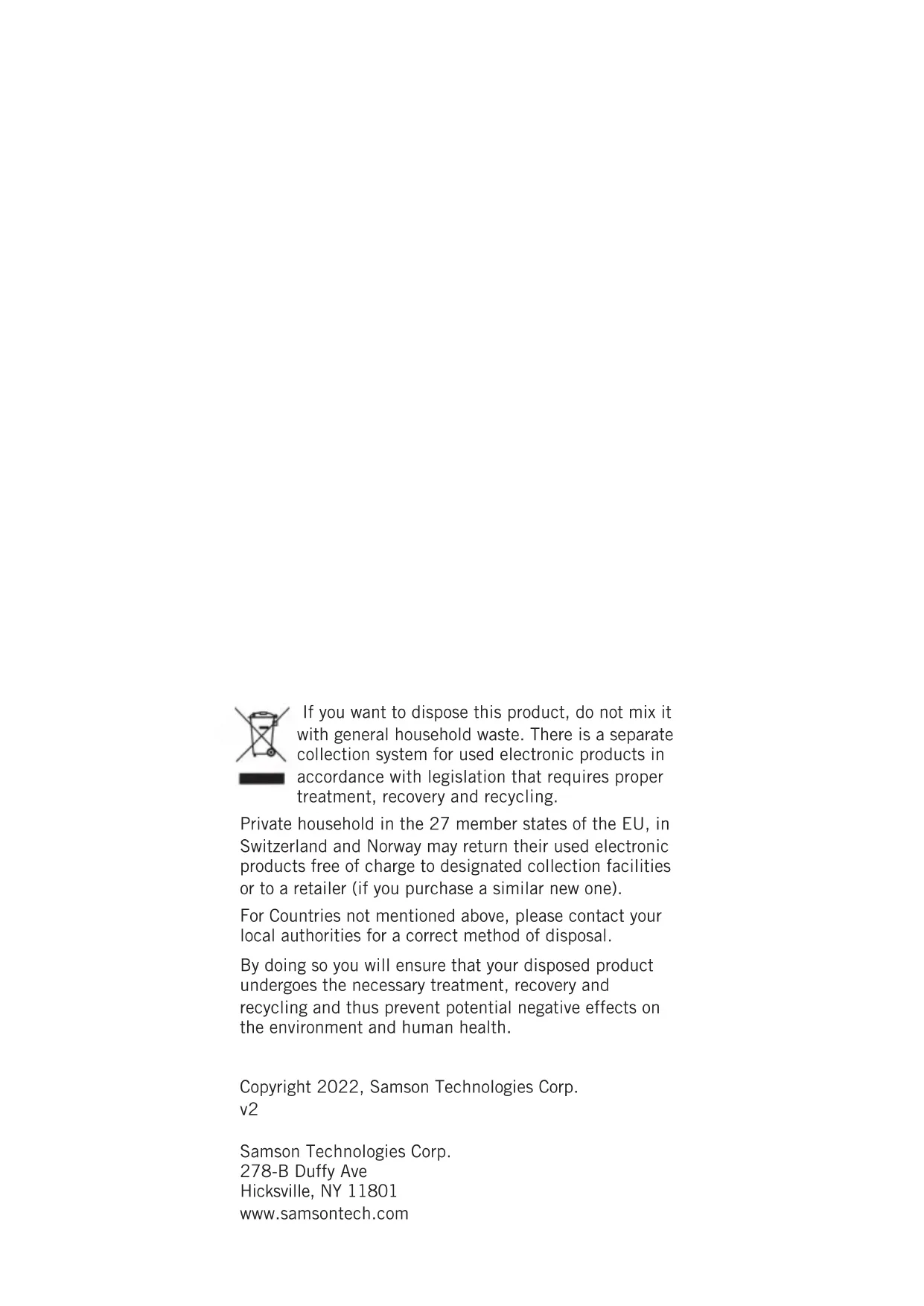 Multi-Pattern Studio Condenser Microphone Owner's ManualIf you want to dispose this product, do not mix it with general household waste. There is a separate collection system for used electronic products in accordance with legislation that requires proper treatment, recovery and recycling. Private household in the 27 member states of the EU, in Switzerland and Norway may return their used electronic products free of charge to designated collection facilities or to a retailer (if you purchase a similar new one). For Countries not mentioned above, please contact your local authorities for a correct method of disposal. By doing so you will ensure that your disposed product undergoes the necessary treatment, recovery and recycling and thus prevent potential negative effects on the environment and human health. Copyright 2022, Samson Technologies Corp.