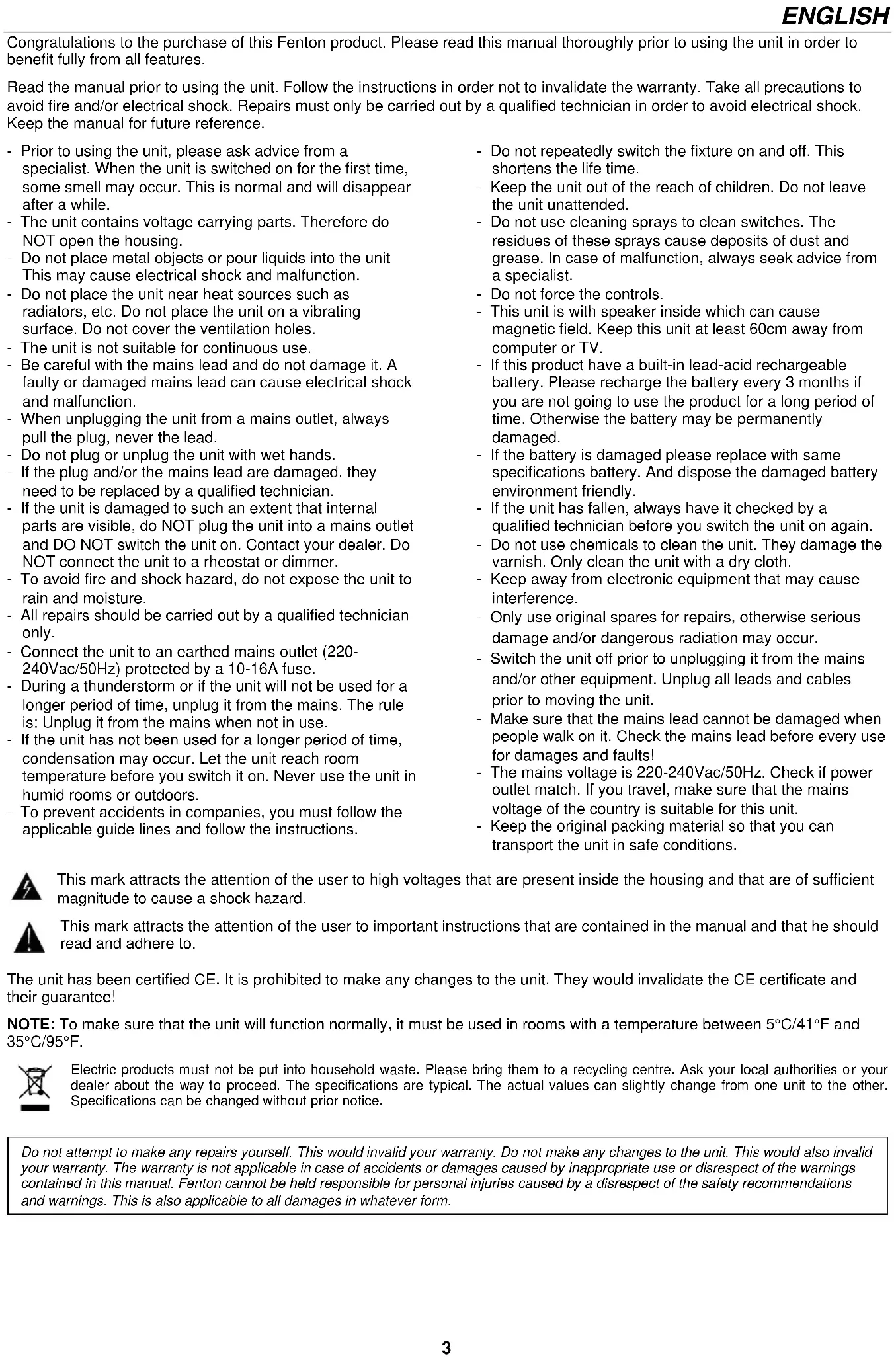 V1.123 ENGLISH Congratulations to the purchase of this Fenton product. Please read this manual thoroughly prior to using the unit in order to benefit fully from all features. Read the manual prior to using the unit. Follow the instructions in order not to invalidate the warranty. Take all precautions to avoid fire and/or electrical shock. Repairs must only be carried out by a qualified technician in order to avoid electrical shock. Keep the manual for future reference. - Prior to using the unit, please ask advice from a specialist. When the unit is switched on for the first time, some smell may occur. This is normal and will disappear after a while. - The unit contains voltage carrying parts. Therefore do NOT open the housing. - Do not place metal objects or pour liquids into the unit This may cause electrical shock and malfunction. - Do not place the unit near heat sources such as radiators, etc. Do not place the unit on a vibrating surface. Do not cover the ventilation holes. - The unit is not suitable for continuous use. - Be careful with the mains lead and do not damage it. A faulty or damaged mains lead can cause electrical shock and malfunction. - When unplugging the unit from a mains outlet, always pull the plug, never the lead. - Do not plug or unplug the unit with wet hands. - If the plug and/or the mains lead are damaged, they need to be replaced by a qualified technician. - If the unit is damaged to such an extent that internal parts are visible, do NOT plug the unit into a mains outlet and DO NOT switch the unit on. Contact your dealer. Do NOT connect the unit to a rheostat or dimmer. - To avoid fire and shock hazard, do not expose the unit to rain and moisture. - All repairs should be carried out by a qualified technician only. - Connect the unit to an earthed mains outlet (220- 240Vac/50Hz) protected by a 10-16A fuse. - During a thunderstorm or if the unit will not be used for a longer period of time, unplug it from the mains. The rule is: Unplug it from the mains when not in use. - If the unit has not been used for a longer period of time, condensation may occur. Let the unit reach room temperature before you switch it on. Never use the unit in humid rooms or outdoors. - To prevent accidents in companies, you must follow the applicable guide lines and follow the instructions. - Do not repeatedly switch the fixture on and off. This shortens the life time. - Keep the unit out of the reach of children. Do not leave the unit unattended. - Do not use cleaning sprays to clean switches. The residues of these sprays cause deposits of dust and grease. In case of malfunction, always seek advice from a specialist. - Do not force the controls. - This unit is with speaker inside which can cause magnetic field. Keep this unit at least 60cm away from computer or TV. - If this product have a built-in lead-acid rechargeable battery. Please recharge the battery every 3 months if you are not going to use the product for a long period of time. Otherwise the battery may be permanently damaged. - If the battery is damaged please replace with same specifications battery. And dispose the damaged battery environment friendly. - If the unit has fallen, always have it checked by a qualified technician before you switch the unit on again. - Do not use chemicals to clean the unit. They damage the varnish. Only clean the unit with a dry cloth. - Keep away from electronic equipment that may cause interference. - Only use original spares for repairs, otherwise serious damage and/or dangerous radiation may occur. - Switch the unit off prior to unplugging it from the mains and/or other equipment. Unplug all leads and cables prior to moving the unit. - Make sure that the mains lead cannot be damaged when people walk on it. Check the mains lead before every use for damages and faults! - The mains voltage is 220-240Vac/50Hz. Check if power outlet match. If you travel, make sure that the mains voltage of the country is suitable for this unit. - Keep the original packing material so that you can transport the unit in safe conditions. This mark attracts the attention of the user to high voltages that are present inside the housing and that are of sufficient magnitude to cause a shock hazard. This mark attracts the attention of the user to important instructions that are contained in the manual and that he should read and adhere to. The unit has been certified CE. It is prohibited to make any changes to the unit. They would invalidate the CE certificate and their guarantee! NOTE: To make sure that the unit will function normally, it must be used in rooms with a temperature between 5°C/41°F and 35°C/95°F. Electric products must not be put into household waste. Please bring them to a recycling centre. Ask your local authorities or your dealer about the way to proceed. The specifications are typical. The actual values can slightly change from one unit to the other. Specifications can be changed without prior notice.