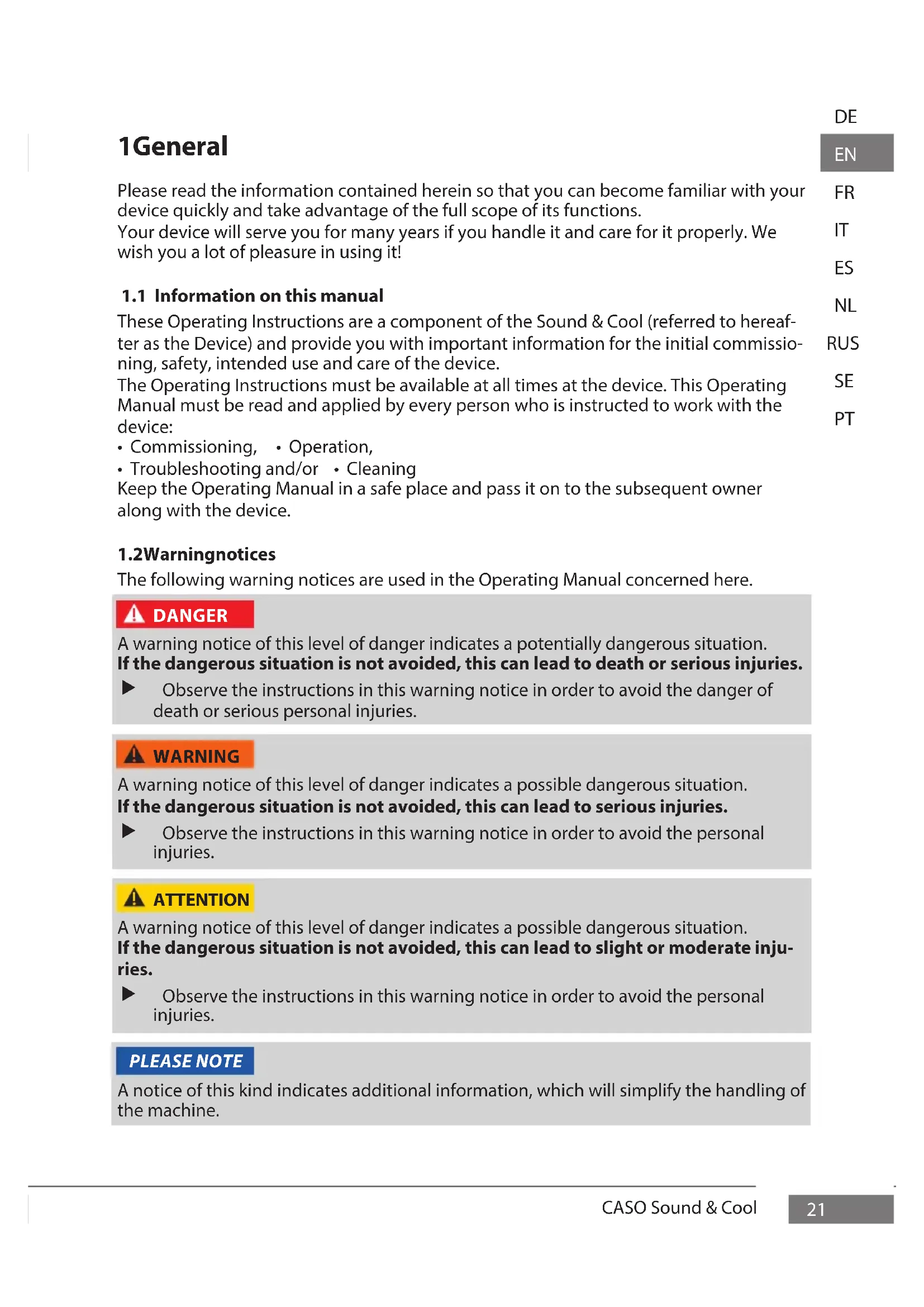 The following warning notices are used in the Operating Manual concerned here. A warning notice of this level of danger indicates a potentially dangerous situation. If the dangerous situation is not avoided, this can lead to death or serious injuries. Observe the instructions in this warning notice in order to avoid the danger of death or serious personal injuries. A warning notice of this level of danger indicates a possible dangerous situation. If the dangerous situation is not avoided, this can lead to serious injuries. Observe the instructions in this warning notice in order to avoid the personal injuries. A warning notice of this level of danger indicates a possible dangerous situation. If the dangerous situation is not avoided, this can lead to slight or moderate inju- ries. Observe the instructions in this warning notice in order to avoid the personal injuries. A notice of this kind indicates additional information, which will simplify the handling of the machine. DANGER WARNING ATTENTION PLEASE NOTECASO Sound & Cool