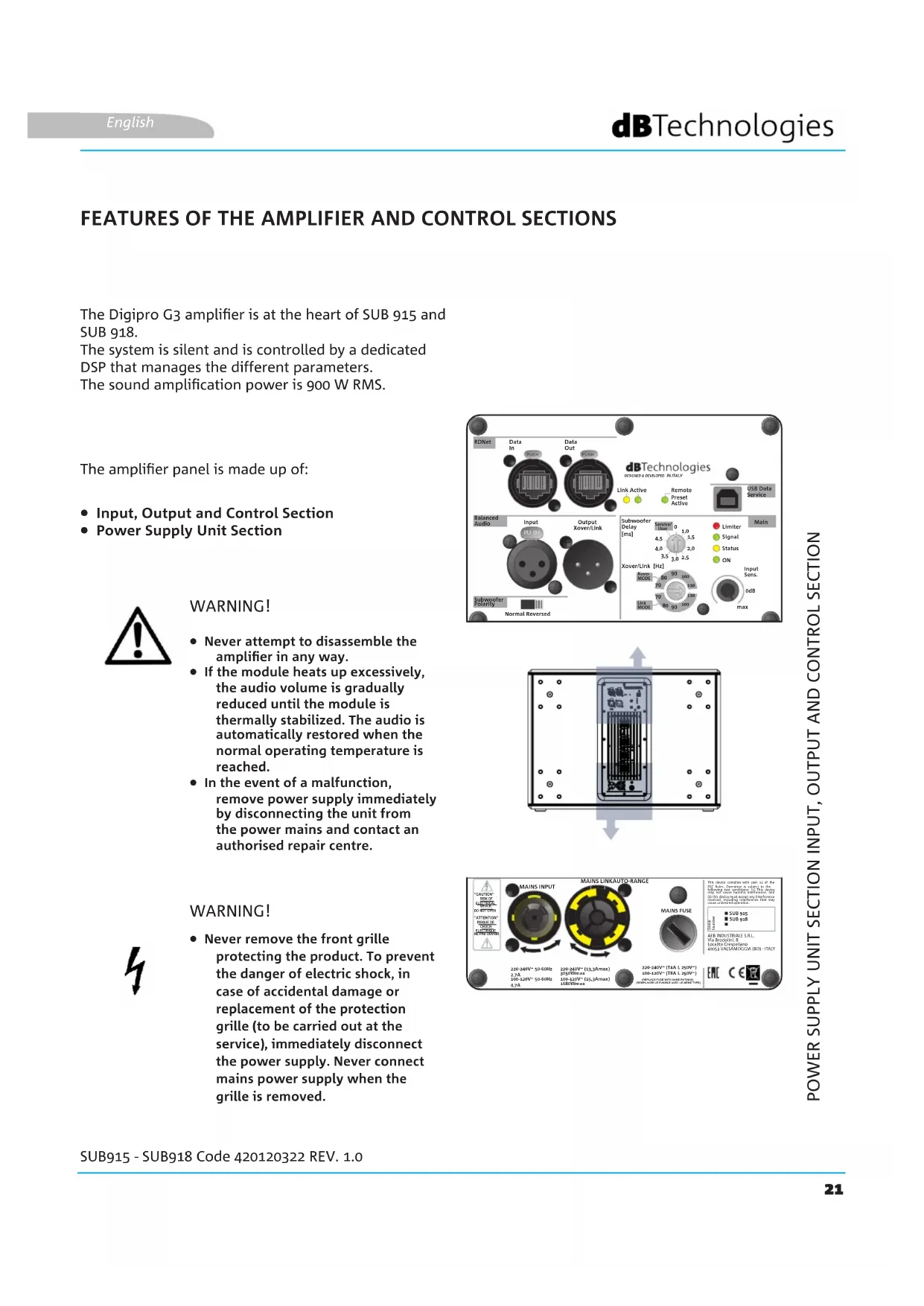 This device complies with part 15 of the FCC Rules. Operation is subject to the following two conditions: (1) This device may not cause harmful interference, and (2) this device must accept any interference received, including interference that may cause undesired operation.Serial Number SUB 915 SUB 918 220-240V~ (13,3Amax) 3050Wmax 100-120V~ (15,3Amax) 1680Wmax 220-240V~ 50-60Hz 2,7A 100-120V~ 50-60Hz 4,7A SUB915 - SUB918 Code 420120322 REV. 1.0 FEATURES OF THE AMPLIFIER AND CONTROL SECTIONS The Digipro G3 amplier is at the heart of SUB 915 and SUB 918. The system is silent and is controlled by a dedicated DSP that manages the different parameters. The sound amplication power is 900 W RMS. The amplier panel is made up of: WARNING!