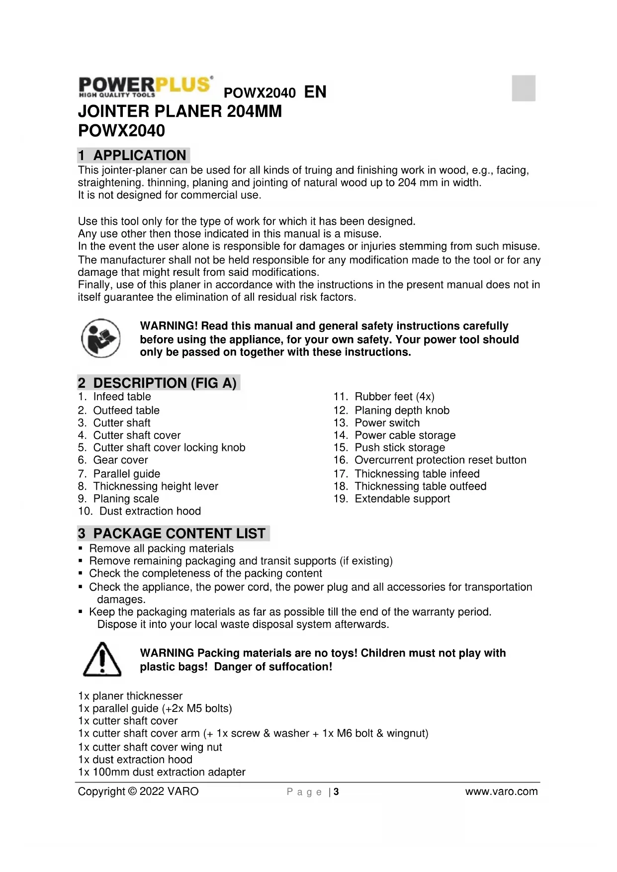 - Keep the packaging materials as far as possible till the end of the warranty period. Dispose it into your local waste disposal system afterwards. WARNING Packing materials are no toys! Children must not play with plastic bags! Danger of suffocation! 1x planer thicknesser 1x parallel guide (+2x M5 bolts) 1x cutter shaft cover 1x cutter shaft cover arm (+ 1x screw & washer + 1x M6 bolt & wingnut) 1x cutter shaft cover wing nut 1x dust extraction hood 1x 100mm dust extraction adapterPOWX2040 EN Copyright © 2022 VARO P a g e | 4 www.varo.com 2x push pad 1x push stick 4x rubber feet (+4x M8 bolts & washers) 1x cutter setting jig 3x hex key (4, 5 & 6mm) 1x thicknessing height lever 1x cutter shaft cover locking knob (+washer) 1x manual When parts are missing or damaged, please contact your dealer. 4 SYMBOLS In this manual and/or on the machine the following symbols are used: