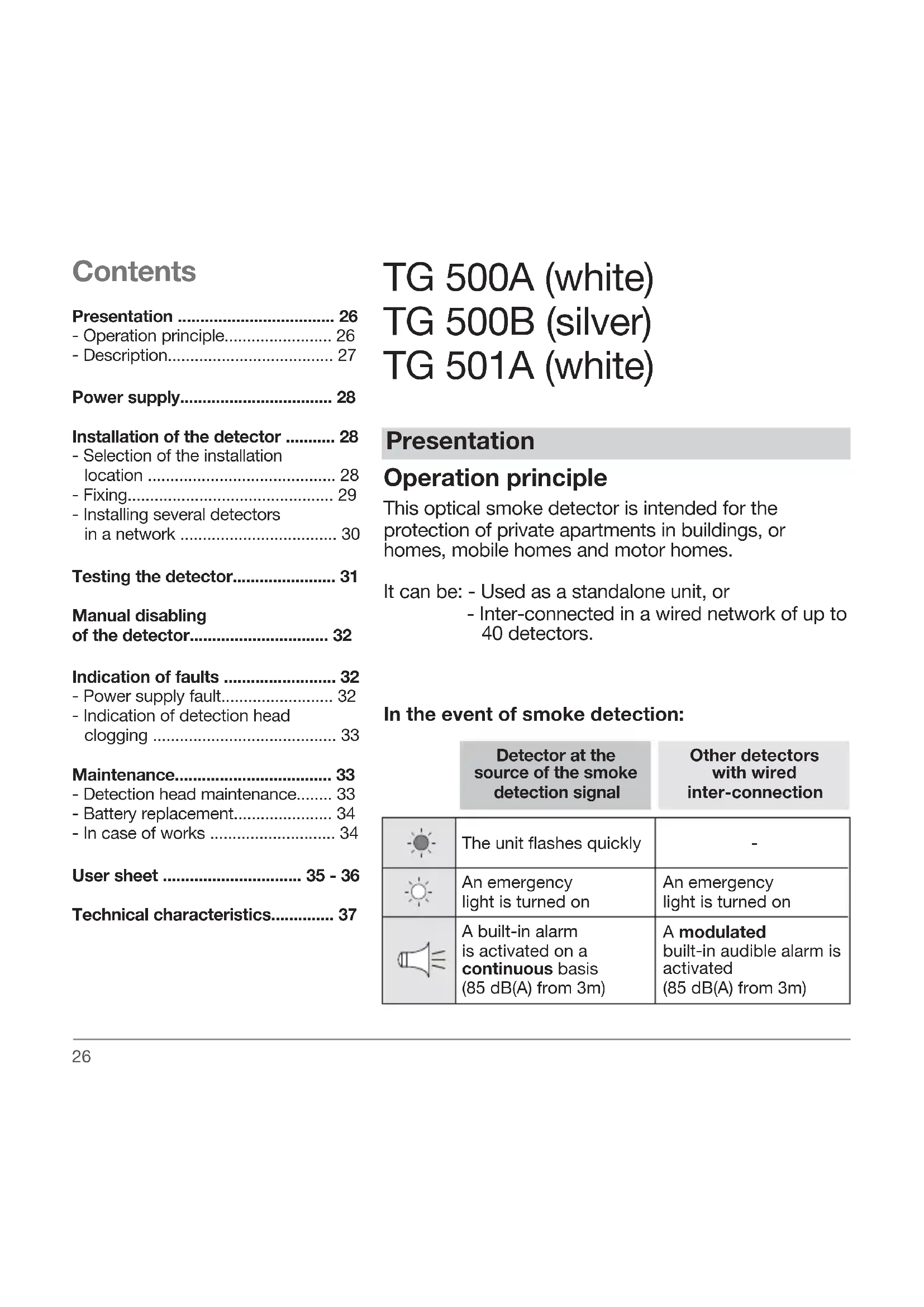 - An emergency light is turned on A modulated built-in audible alarm is activated (85 dB(A) from 3m) The unit flashes quickly Detector at the source of the smoke detection signal An emergency light is turned on Other detectors with wired inter-connection A built-in alarm is activated on a continuous basis (85 dB(A) from 3m) TG 500A (white) TG 500B (silver) TG 501A (white) Operation principle This optical smoke detector is intended for the protection of private apartments in buildings, or homes, mobile homes and motor homes. It can be: - Used as a standalone unit, or - Inter-connected in a wired network of up to 40 detectors. In the event of smoke detection: Presentation Presentation p. 26