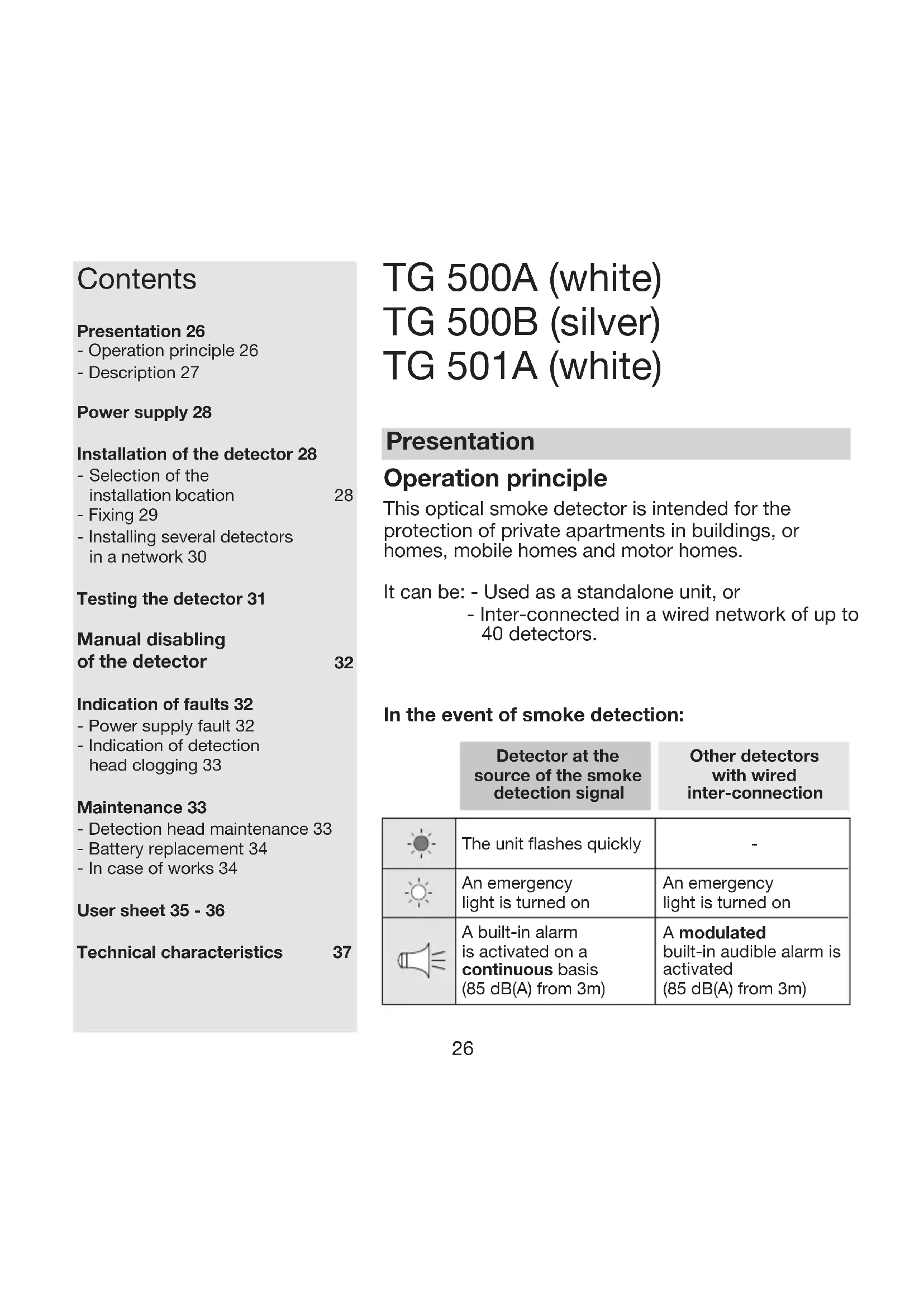 Indication of faults 32- Power supply fault 32- Indication of detection head clogging 33Maintenance 33- Detection head maintenance 33- Battery replacement 34- In case of works 34User sheet 35 - 36Technical characteristics 37 TG 500A (white) TG 500B (silver) TG 501A (white) Operation principle This optical smoke detector is intended for the protection of private apartments in buildings, or homes, mobile homes and motor homes. It can be: - Used as a standalone unit, or - Inter-connected in a wired network of up to 40 detectors. In the event of smoke detection: Presentation27