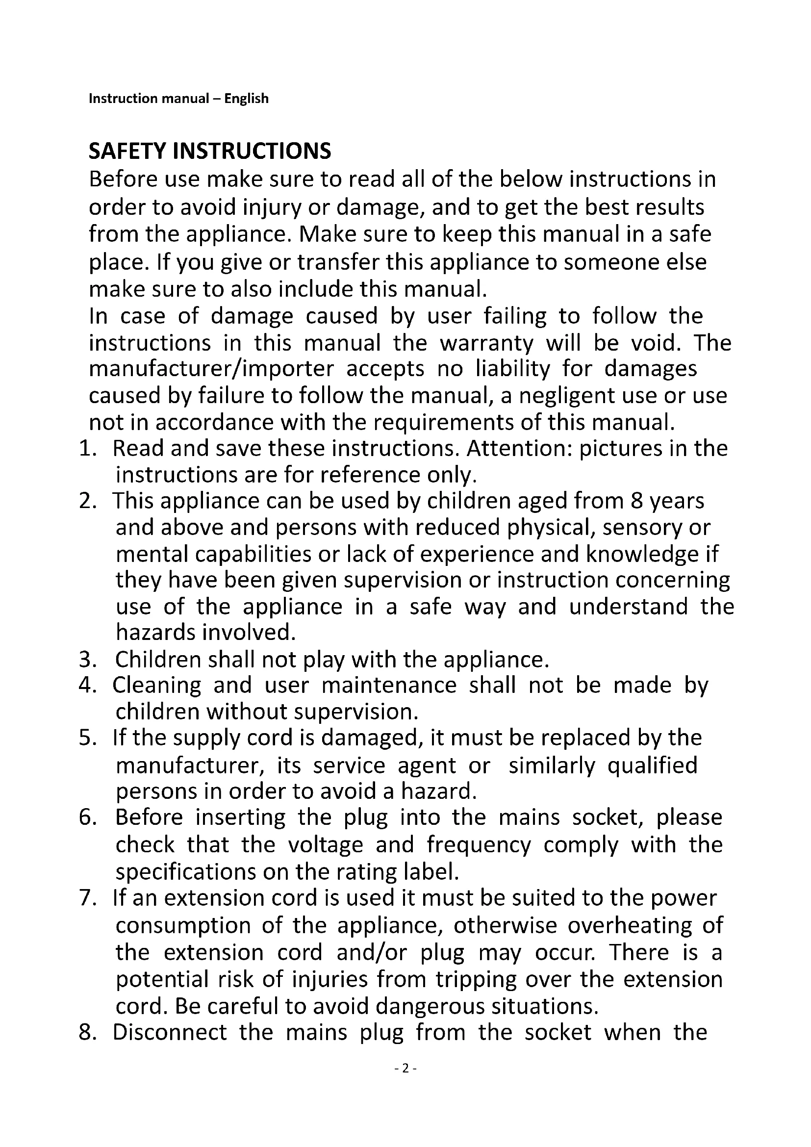 Before delivery our devices are subjected to rigorous quality control. If, despite all care, damage has occurred during production or transportation, please return the device to your dealer. In addition to statutory legal rights, the purchaser has an option to claim under the terms of the following guarantee: For the purchased device we provide 2 years guarantee, commencing from the day of sale. If you have a defective product, you can directly go back to the point of purchase. Defects which arise due to improper handling of the device and malfunctions due to interventions and repairs by third parties or the fitting of non-original parts are not covered by this guarantee. Always keep your receipt, without the receipt you can’t claim any form of warranty. Damage caused by not following the instruction manual, will lead to a void of warranty, if this results in consequential damages then we will not be liable. Neither can we hold responsible for material damage or personal injury caused by improper use or if the instruction manual are not properly executed. Damage to accessories does not mean free replacement of the whole appliance. In such case please contact our service department. Broken glass or breakage of plastic parts is always subject to a charge. Defects to consumables or parts subjected to wearing, as well as cleaning, maintenance or the replacement of said parts are not covered by the warranty and are to be paid.- 13 -