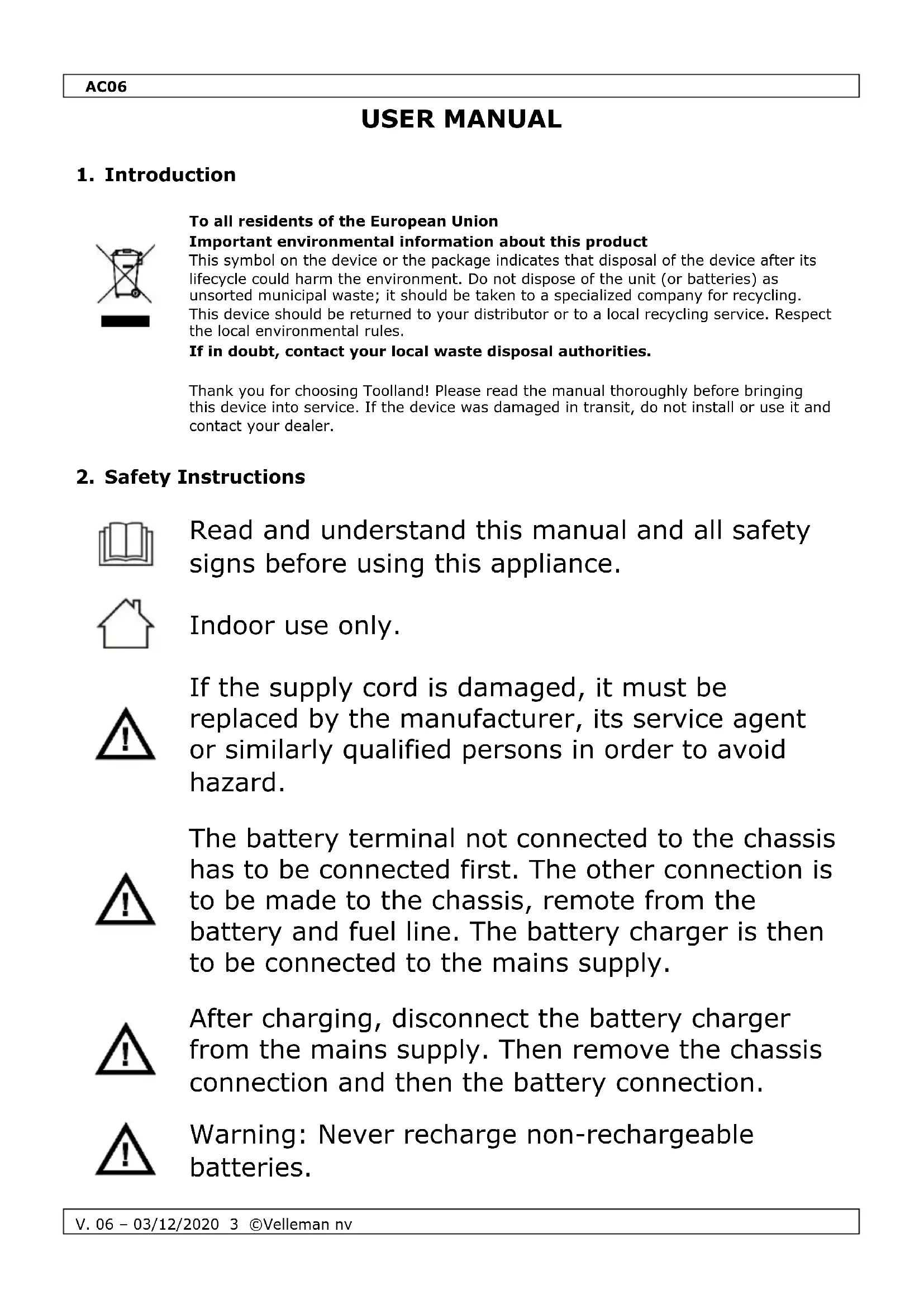Download the instructions for your Battery charger in PDF format for free! Find your manual AC06 - Toolland and take your electronic device back in hand. On this page are published all the documents necessary for the use of your device. AC06 by Toolland.